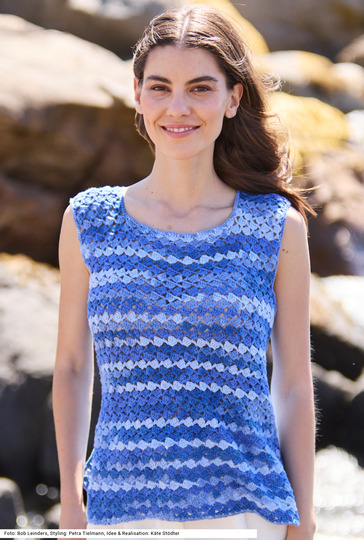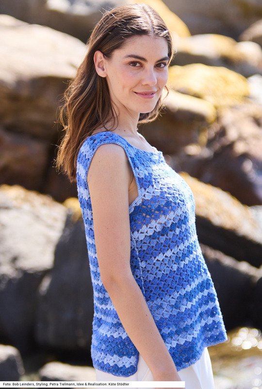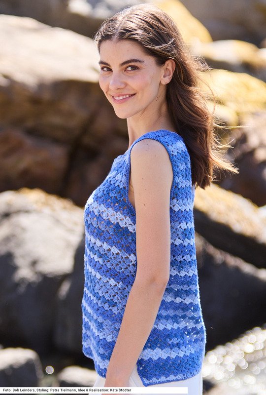 Ein Top mit eckigen Armausschnitten und eckigem Halsausschnitt sowie Seitenschlitzen ist nicht nur bequem zu tragen, es lässt sich auch einfach häkeln. Für das Muster braucht es nur Stäbchen und Luftmaschen. Feste Maschen werden nur um den Halsausschnitt und den Saum- und die Schlitzränder gehäkelt. Durch das Verlaufsgarn – aus reiner Baumwolle – in harmonischen Farbtönen kommt mühelos Spannung in das Ganze. Eine Anleitung kann für vier Größen (36/38 und 40/42 sowie 44/46 und außerdem 48/50) downgeloadet werden.