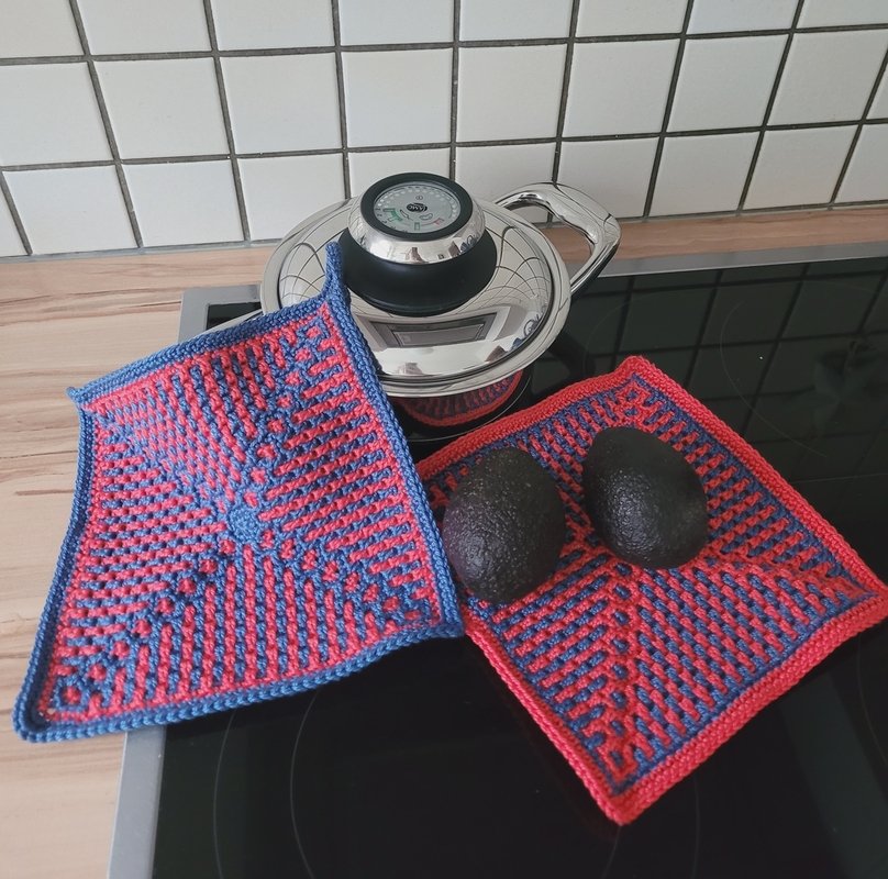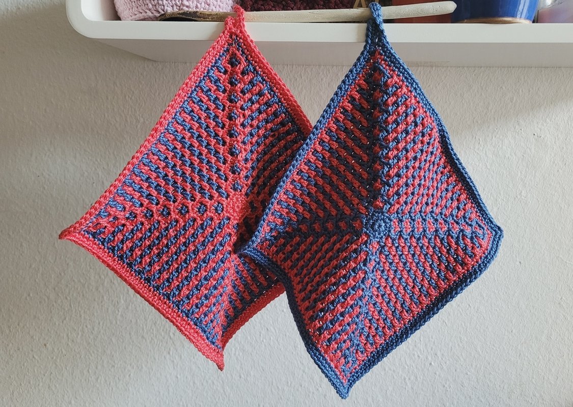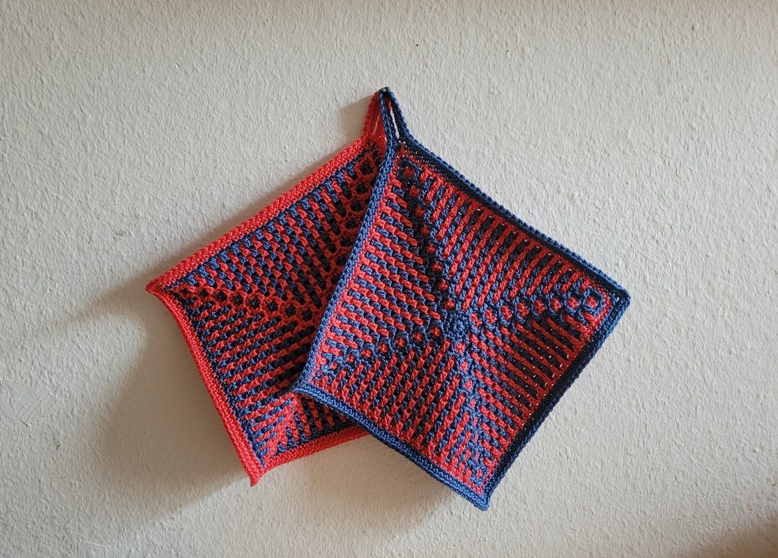 Topflappen, die im Mosaikmuster gehäkelt werden, haben immer eine dichte Struktur.