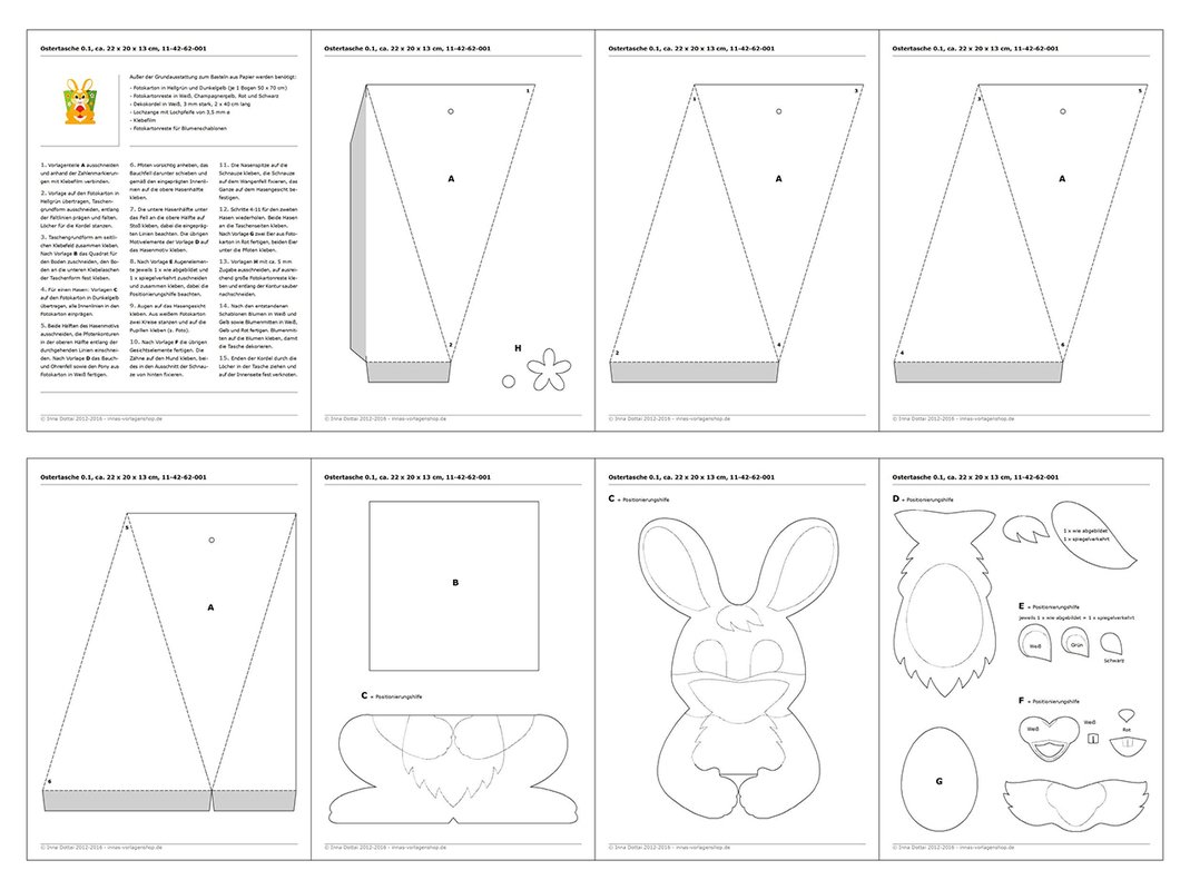 Die Tasche an sich ist einfach und schnell zu basteln, die Hasen dagegen bestehen aus vielen Einzelteilen, die z.T. in bestimmter Reihenfolge zusammengefügt werden müssen, aber das alles wird in der Bastelanleitung genauestens erklärt.