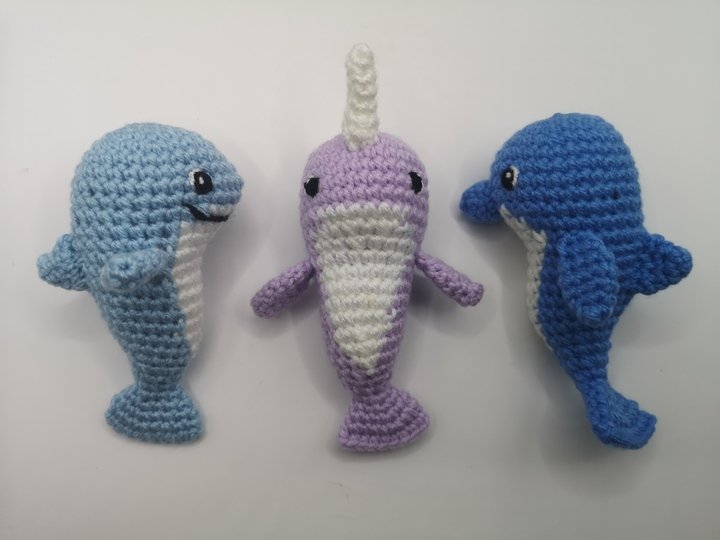 3 in 1 Häkelanleitung: Mit dieser Anleitung kannst du einen Hai, Delfin oder Narwal häkeln. Die Größe eignet sich perfekt als Anhänger/Charm, für ein Mobile, oder einfach als kleines Kuscheltier oder Glücksbringer.