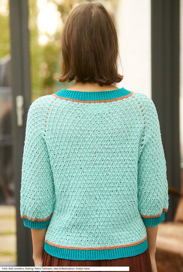 Wer nicht gerne zusammennäht, für den ist dieser Raglanpullover mit kurzen Ärmeln genau das Richtige, denn er wird von oben nach unten in einem Stück gearbeitet. Das Fantasiemuster wird ähnlich gestrickt wie das bekannte Dornröschenmuster, jedoch mit mehr Maschen für die Noppen. Die Blenden in zweierlei Kontrastfarben rahmen das unifarbene Strukturmuster ausdrucksstark ein; sie sind im Rippenmuster und kraus rechts gearbeitet. Für den Sommer passt hier ein reines Baumwollgarn. Eine Anleitung steht für die Größen 36/38, 40/42 und 44/46 zur Verfügung.