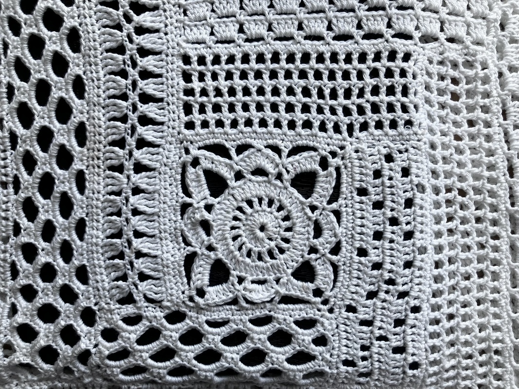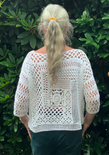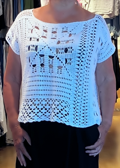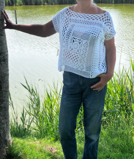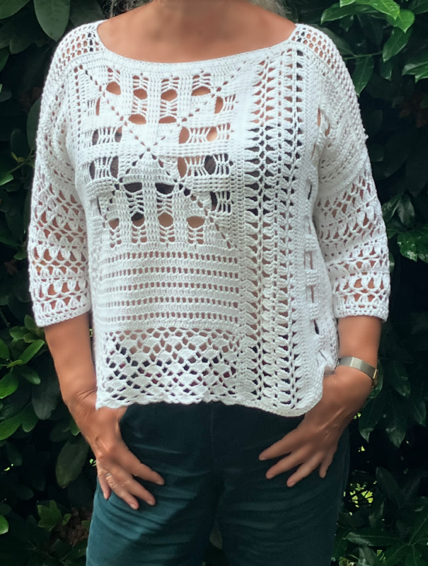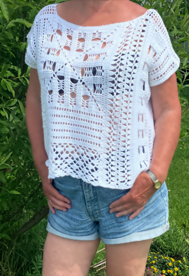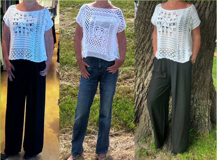 In dieses Shirt habe ich 2 Ideen einfließen lassen. Ich wollte mal eine Spirale mit unterschiedlichen Mustern erzeugen und als Gegenstück auf der anderen Seite einen eher geometrischen Grannysquare ins Zentrum setzen. So ist es ein Wende-Shirt geworden. Vorder- und Rückenseite haben die gleiche Form. Da ist das Wenden kein Problem. Du kannst dich aber auch für eine Variante entscheiden und das Rückenteil schlicht in einem Muster häkeln. Du kannst dieses Shirt – wie ich – oversized gestalten oder eher figurbetont häkeln. Auch die Länge und die Breite sind beliebig möglich. Du kannst es mit oder ohne Ärmel arbeiten. Alles wird ausführlich für alle Größen erklärt.