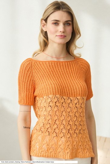 Der Raglanpulli mit kurzen Ärmeln ist von oben nach unten in Runden gestrickt. Strenge Rippen in der Raglanpasse und ein leichtes, luftiges Rankenmuster im unteren Bereich werden zusätzlich durch unterschiedliche Farbtöne unterstrichen. Obwohl die Tasche dasselbe Rankenmuster hat, wirkt dieses Ajourmuster ganz anders. Das liegt am Garn, ein weiches, gefülltes Schlauchbändchen aus Baumwolle und Polyamid mit einer wesentlich kürzeren Lauflänge als das Garn des Pullis, das aus Baumwolle, Viskose und Leinen gesteht. Eine Anleitung für das Set gibt es für die Größen 36/38, 40/42 sowie 44/46 und für die Tasche mit 35 x 25 cm.
