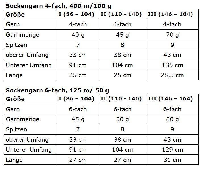 Es gibt mehrere Größen, eine detaillierte Anleitung für 4-fach und 6-fach Sockenwolle sowie eine Beschreibung, wie man die Größe verändern kann.