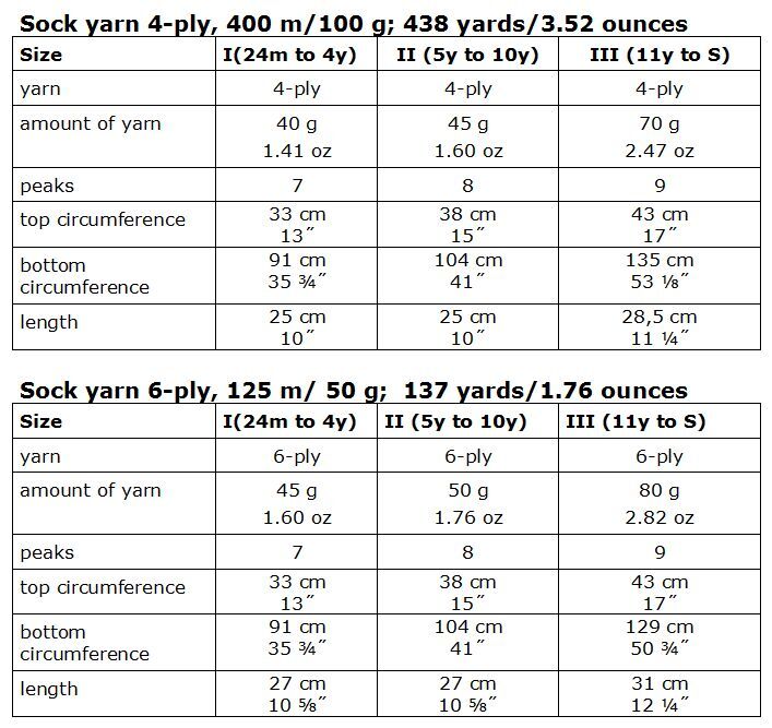 oder: 6-fach Sockenwolle, je nach Größe 45 bis 80 g (siehe Fotos, Tabellen)
