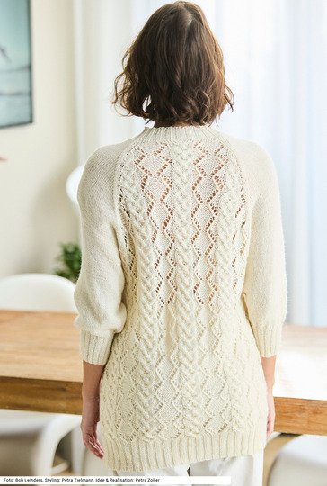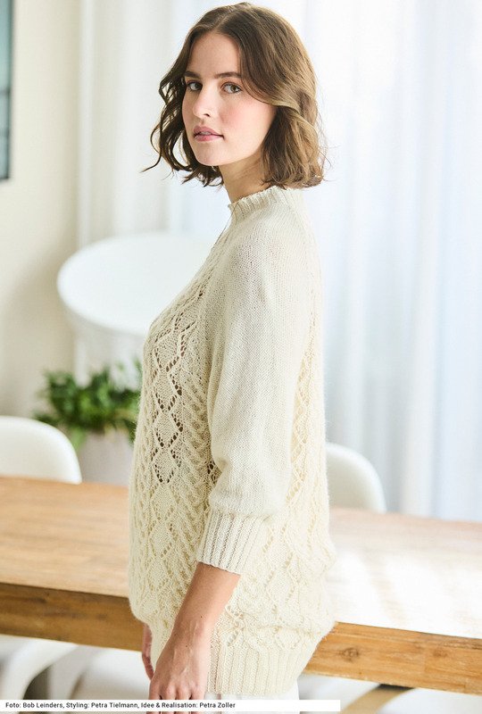 So schön kann die Kombination aus Aranmuster und Ajourrauten sein. In der Mitte des Pullis wechseln sich diese beiden Muster auf vortreffliche Weise ab. Die Ärmel hingegen sind glatt rechts gearbeitet und haben betonte Abnahmen an den extrahohen, besonders bequemen Raglanschrägungen entlang. Saum- und Ärmelbündchen wie auch der Stehkragen sind im 2/2-Rippenmuster gestrickt. Das Garn, das aus Schurwolle, Mohair und Seide besteht, sorgt zudem für hohen Tragekomfort. Eine Anleitung kann für die Größen 38/40 und 44/46 downgeloadet werden.