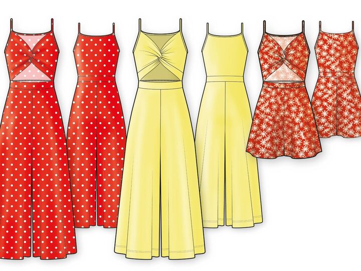 Dieser raffinierte Overall wird aus weichem Jersey genäht und kommt ganz ohne störenden Reißverschluss aus – einfach reinschlüpfen und wohlfühlen! Das gedrehte Oberteil verleiht dem Look eine verspielte Note und schmeichelt jeder Brustform. Ein BH kann problemlos darunter getragen werden und bleibt dabei nahezu unsichtbar. Die weit geschnittene Culotte-Hose schwingt bei jedem Schritt luftig mit und sorgt für maximalen Tragekomfort – stylisch und bequem zugleich. Die Hose kann in lang oder kurz genäht werden.