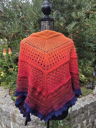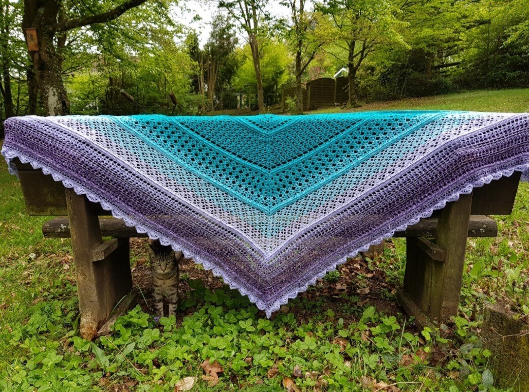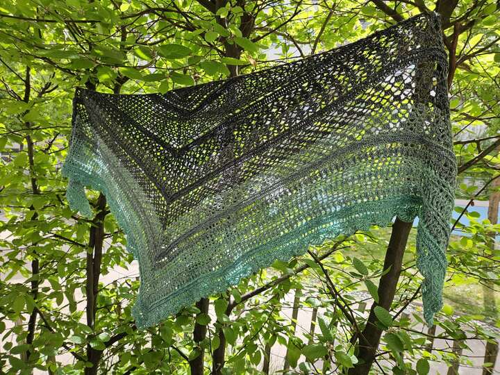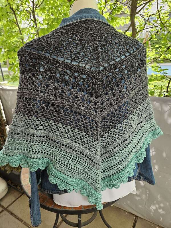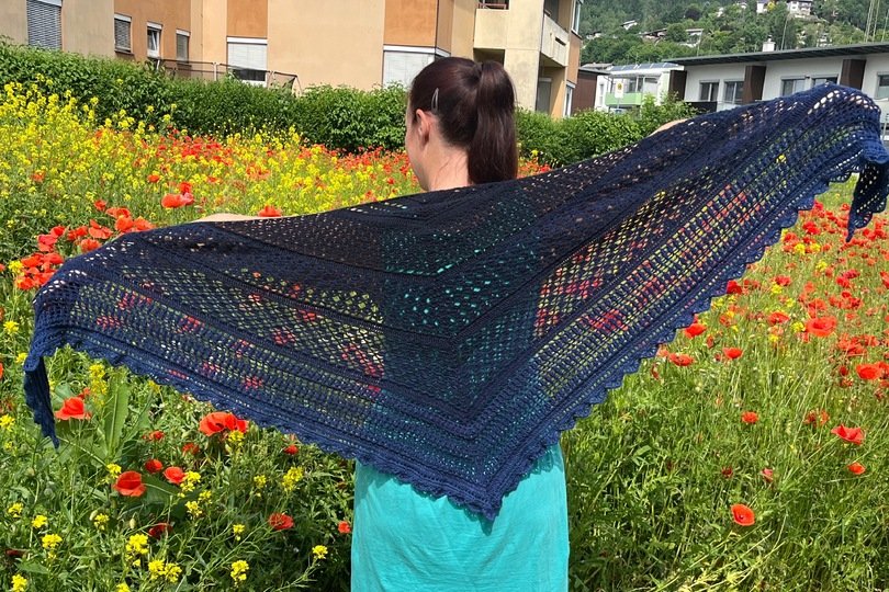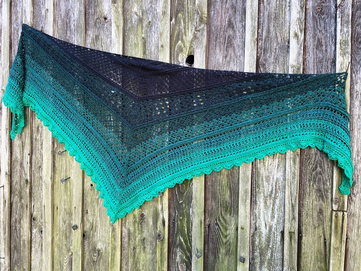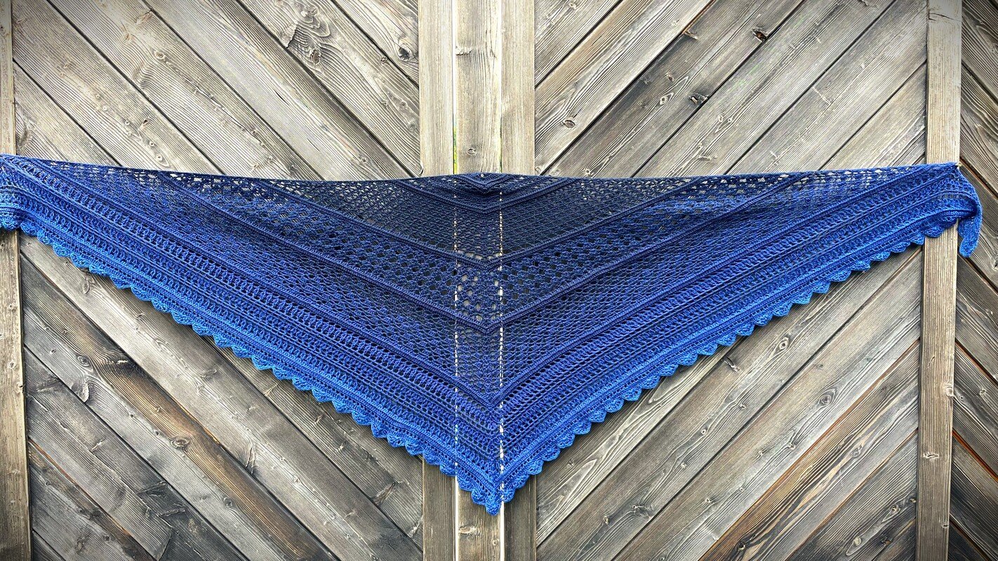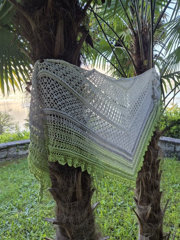 Mad Gap ist ein symmetrisches Dreieckstuch bestehend aus 5 verschiedenen Mustern und einer wunderschönen Abschlussborte.