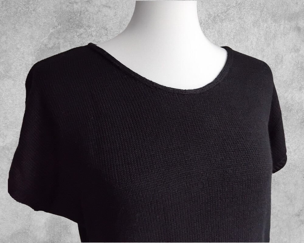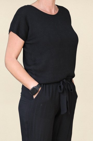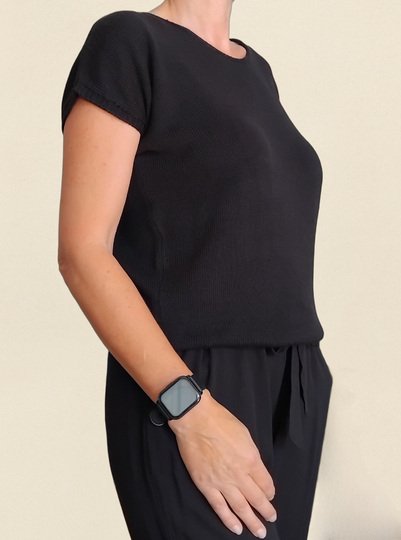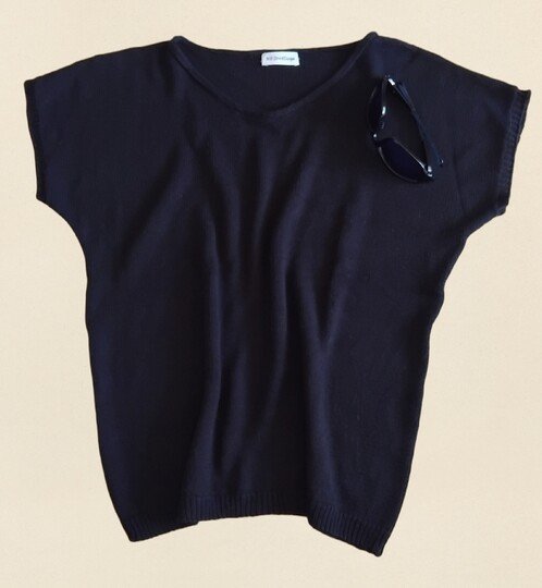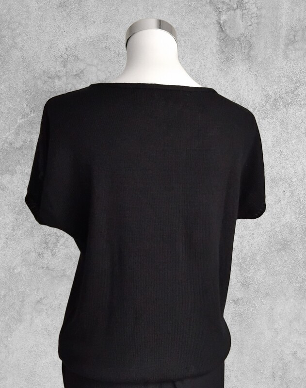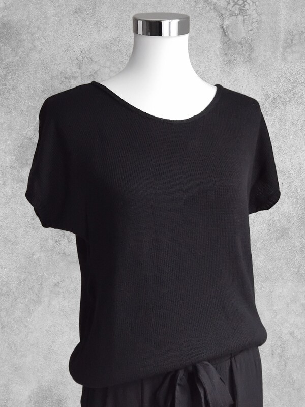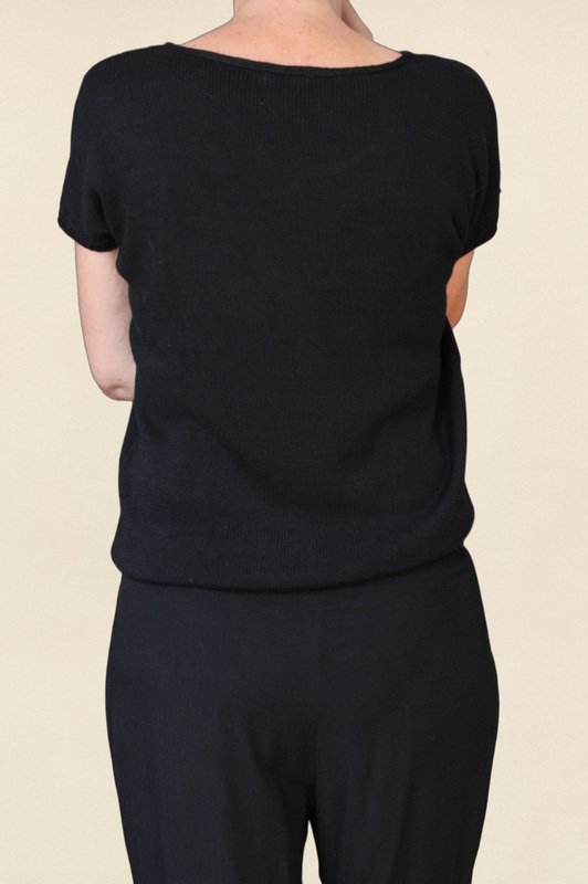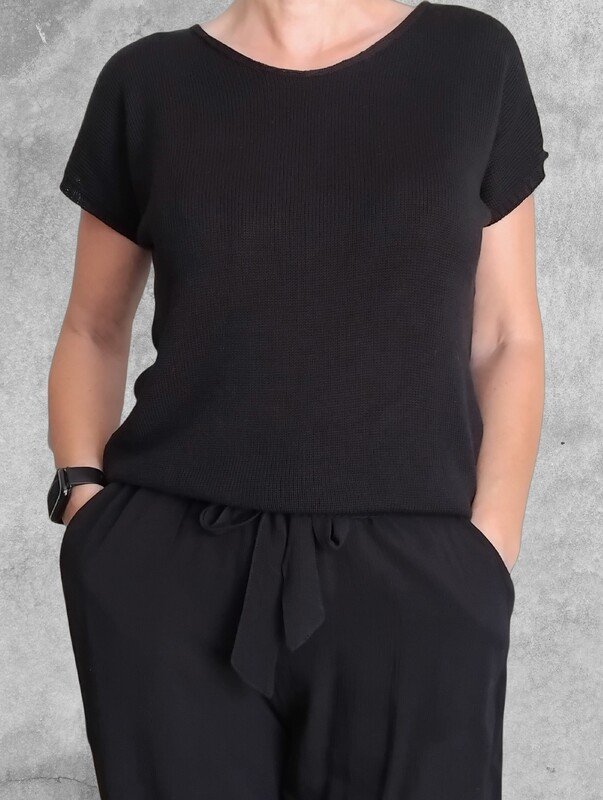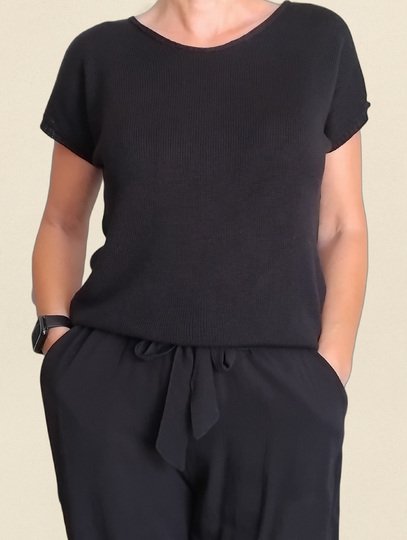 Ein leichtes Top mit kurzen Ärmeln in klassischem Schwarz – dezent, modern und kombinationsfreudig. Das schlichte Glatt-rechts-Muster sorgt für ein ruhiges, ebenmäßiges Maschenbild und macht das Top zu einem stilvollen Basic für jede Gelegenheit – solo getragen im Sommer oder als elegante Schicht unter einem Blazer.