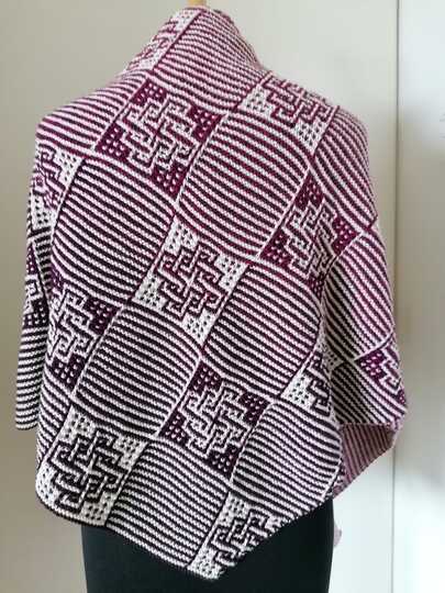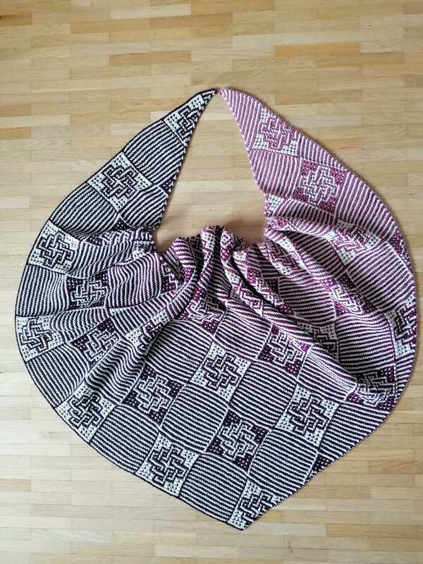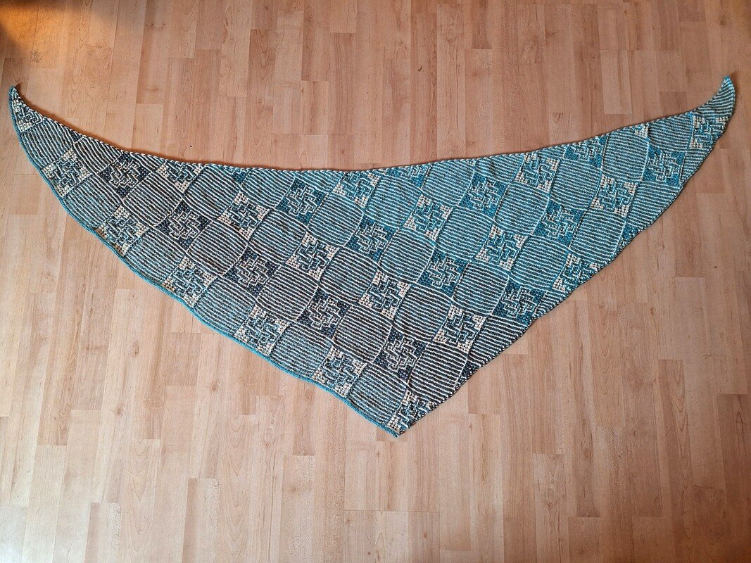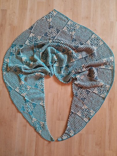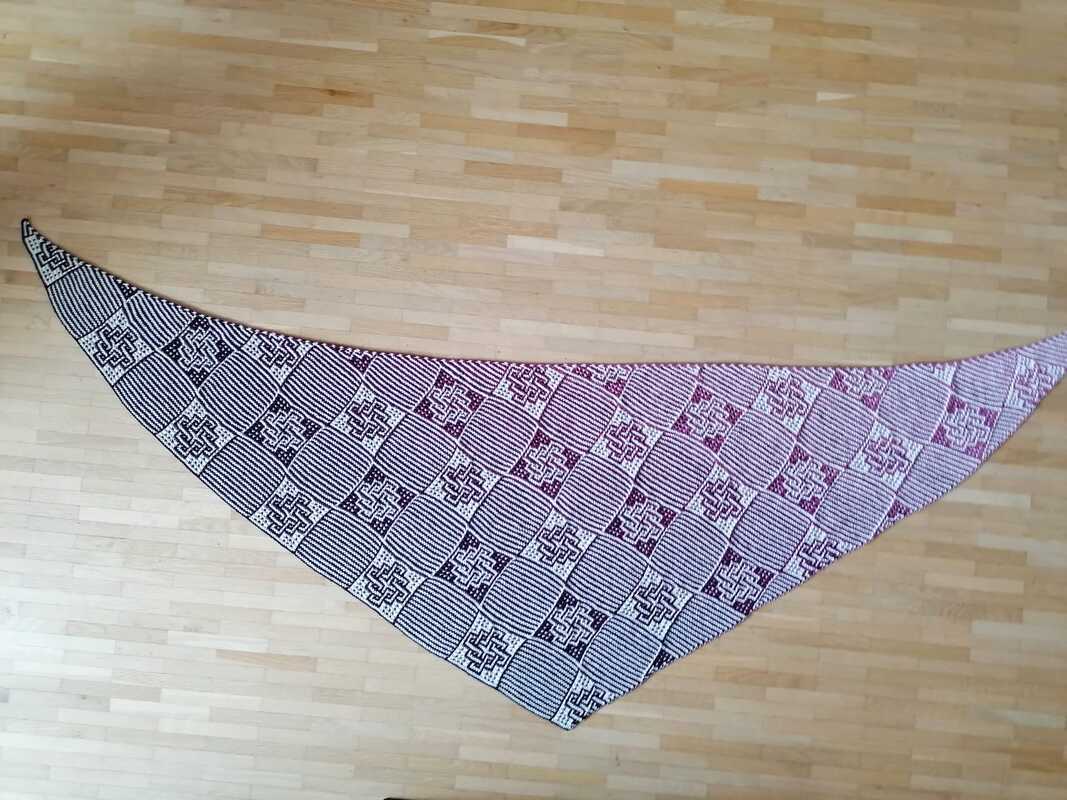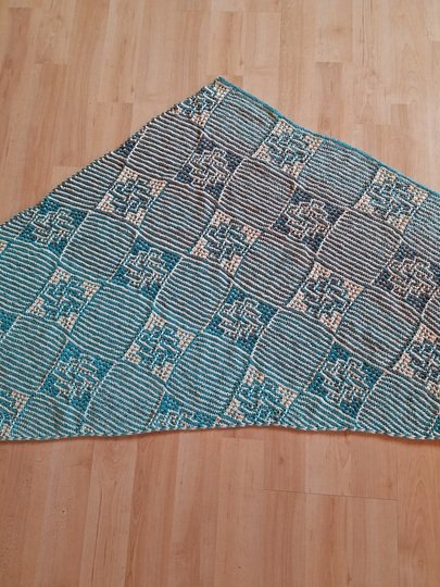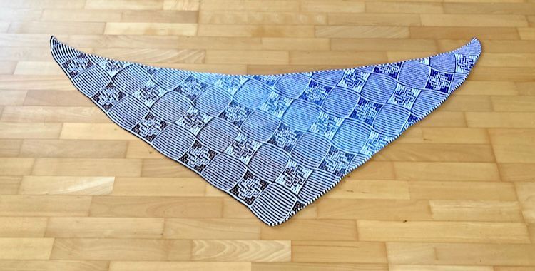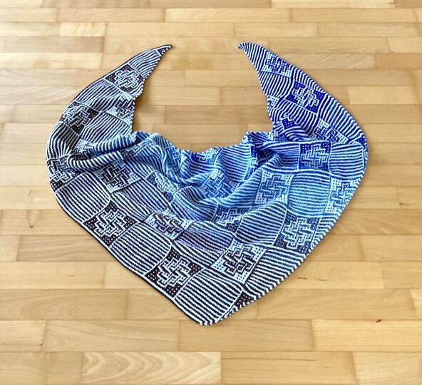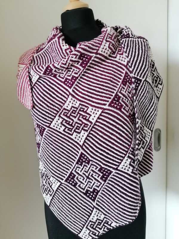 Es ist ein gleichschenkeliges Dreieckstuch mit Hebemaschen Blöcken eingearbeitet.