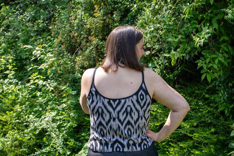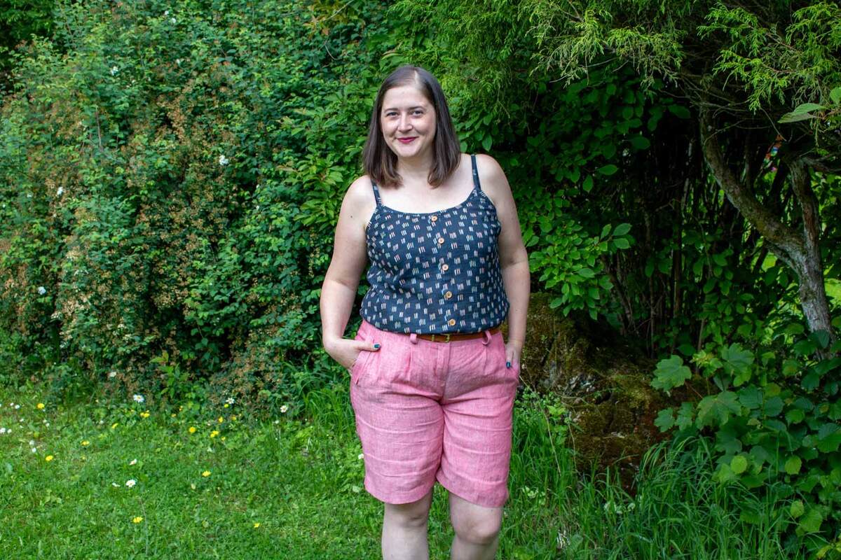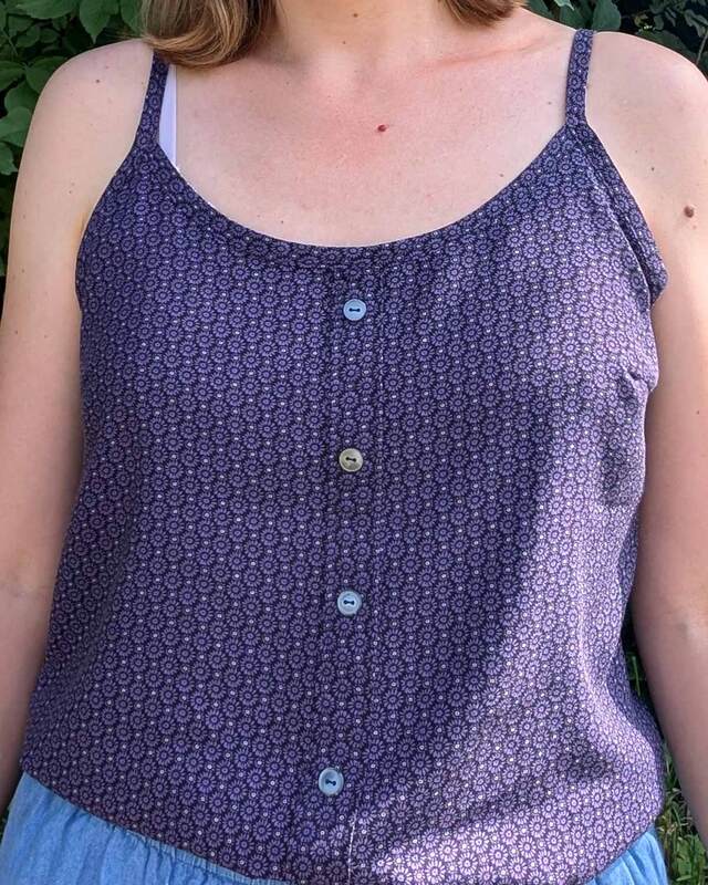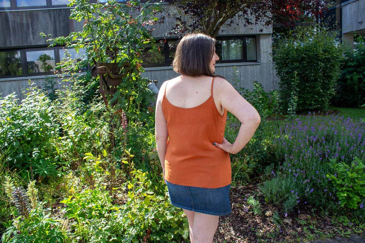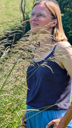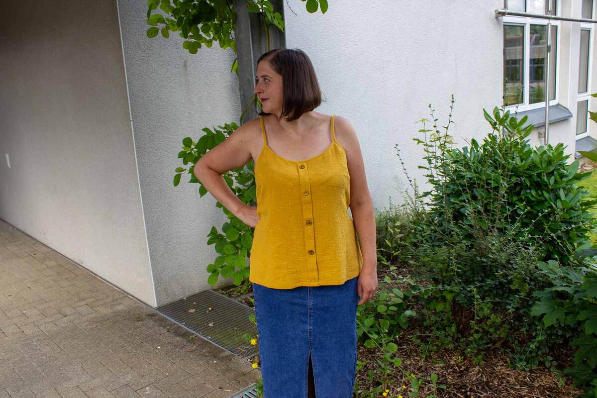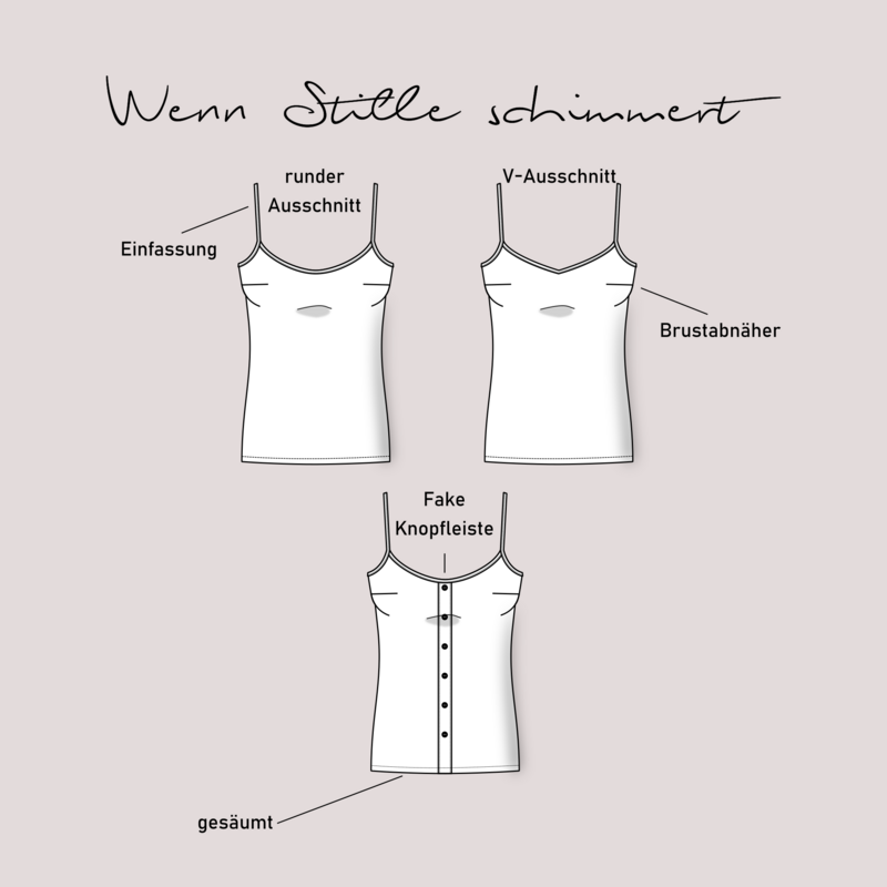 Dieser Schnitt für ein Spaghetti Träger Top aus Webware mit rundem Ausschnitt vorne oder V-Ausschnitt und einer optionalen Fake-Knopfleiste, trägt den schönen Namen "Wenn Stille schimmert".