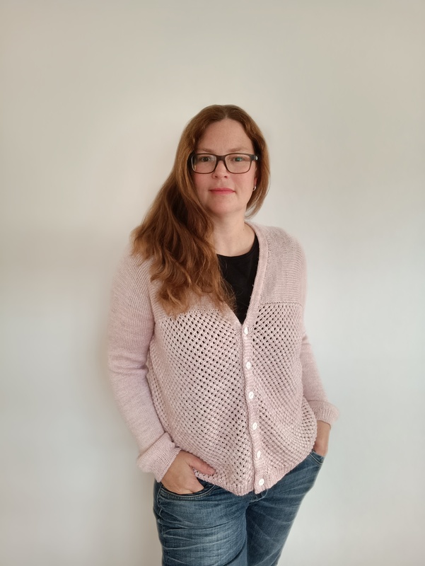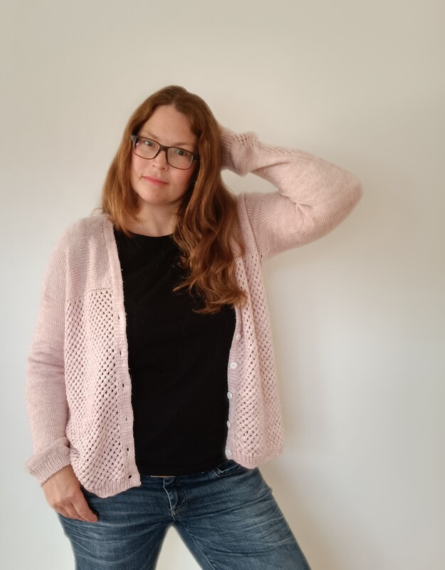 Sie ist hinten länger als vorne ‒ je nach eigener Statur / Körperform. Begonnen wird mit einem provisorischen Anschlag im Rücken, von wo aus die Schultern und die Ärmel gestrickt werden. Der Körper wird im Rosenmuster gerade herunter gestrickt. Die Strickjacke kann mit oder ohne Knöpfe gestrickt werden. Die Anleitung enthält englische Abkürzungen mit der deutschen Erklärung sowie Videos zur Erklärung einzelner Techniken.