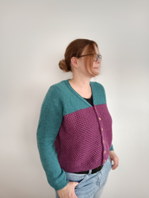 Die Strickjacke wird von oben nach unten mit verkürzten Reihen und mit einer direkt angestrickten Blende gearbeitet.