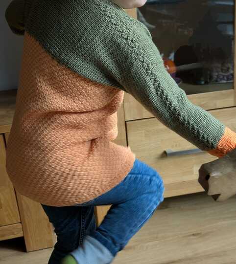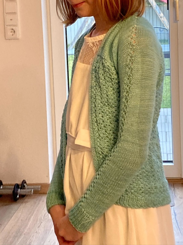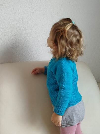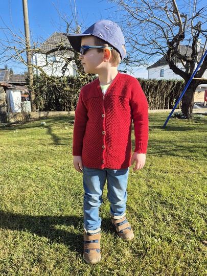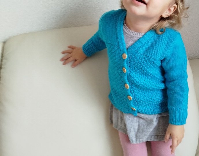 Die Kinder Strickjacke wird von oben nach unten, mit verkürzten Reihen und mit einer direkt angestrickten Blende gearbeitet.