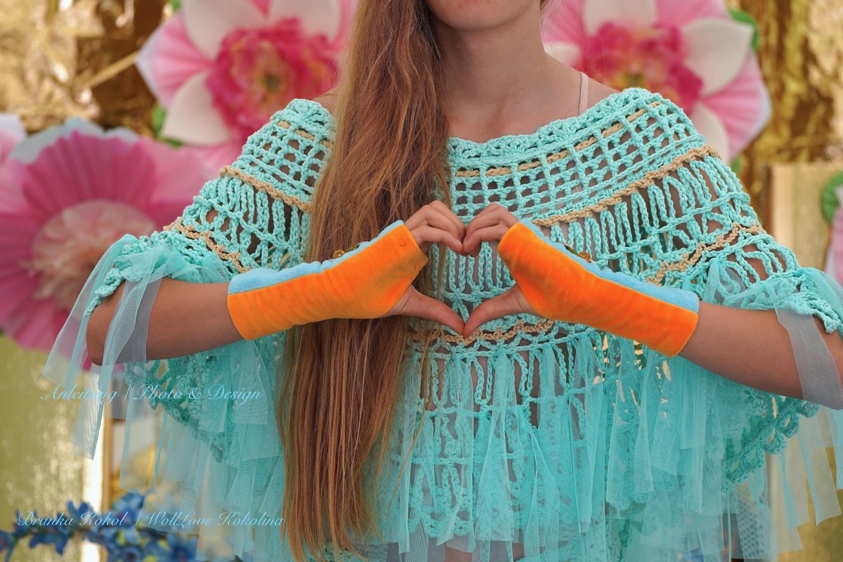 Du kannst es quer über die Schultern oder asymetrisch tragen. Als Poncho an sich zu allem gut zu kombinieren oder im Set mit passendem Rock, der etwas verlängert wird. Der Rock ist schön über einem farbigem Unterrock / Leggings und als Strand Begleiter. Ich liebe es. Viel Freude damit.