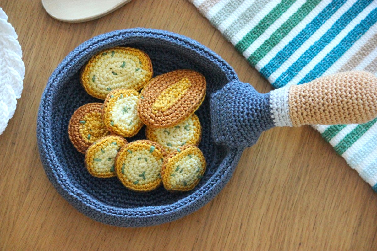Die Kartoffelscheiben kannst du hier in drei verschiedenen Grössen/Formen häkeln, so dass mehr Vielfalt auf dem Teller entsteht. Die kleine Pfanne ist so entworfen, dass du sie hochheben kannst, ohne dass sie komplett abknickt, selbst wenn sie mit Bratkartoffeln gefüllt ist. Sie ist ausserdem gross genug, dass andere Leckereien aus meinen Anleitungen (z.B. die Pfannkuchen, die Nudeln oder die Hähnchenbrust) ebenfalls hineinpassen :-)