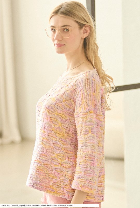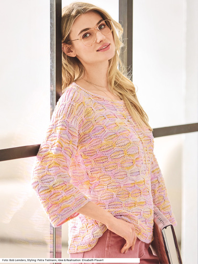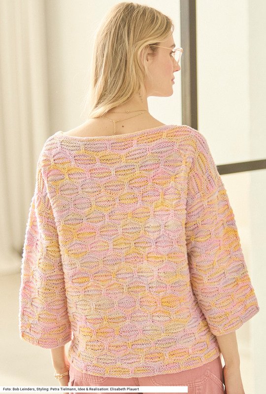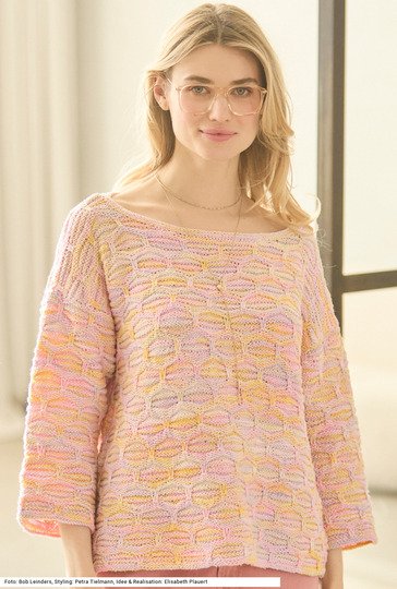 So einfach wie genial: Beim Muster dieses Pullis werden im Prinzip nur rechte und linke Maschen gestrickt, jedoch entsteht der wabenartige Effekt dadurch, dass versetzt immer zwei Maschen über ganze zehn Reihen abgehoben werden. Der Pullover ist ganz gerade geschnitten und hat dreiviertellange, offene Ärmel, die nach oben hin weiter werden. Das Farbverlaufsgarn aus reiner Baumwolle gibt es in vielen Variationen, bei denen immer vier harmonisch zueinander passende Farbtöne gemischt sind. Eine Anleitung dazu steht in den Größen 36/38, 40/42 und 44/46 zur Verfügung.