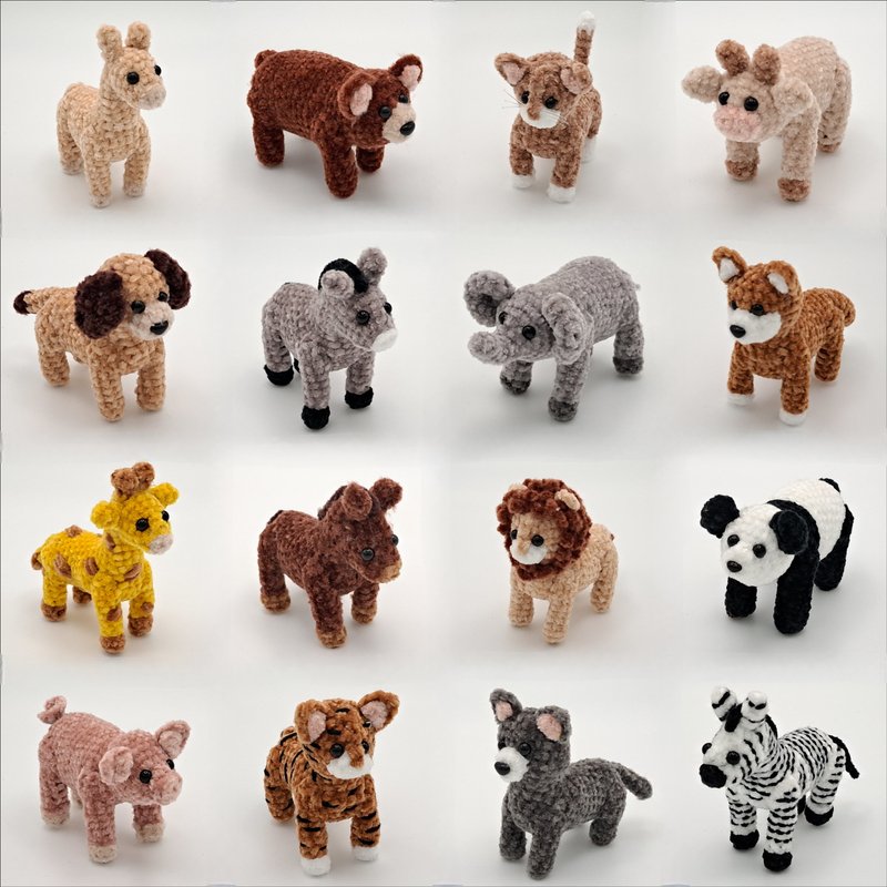 Mit einem dünnen Chenille Garn (40g / 148m) und einer Häkelnadel Nr. 2,0 wird das Tier ca. 7,5 cm lang und 8 cm hoch.