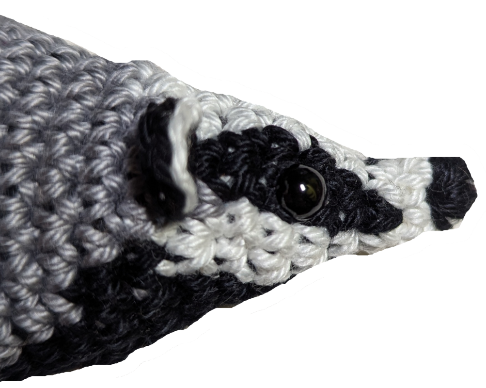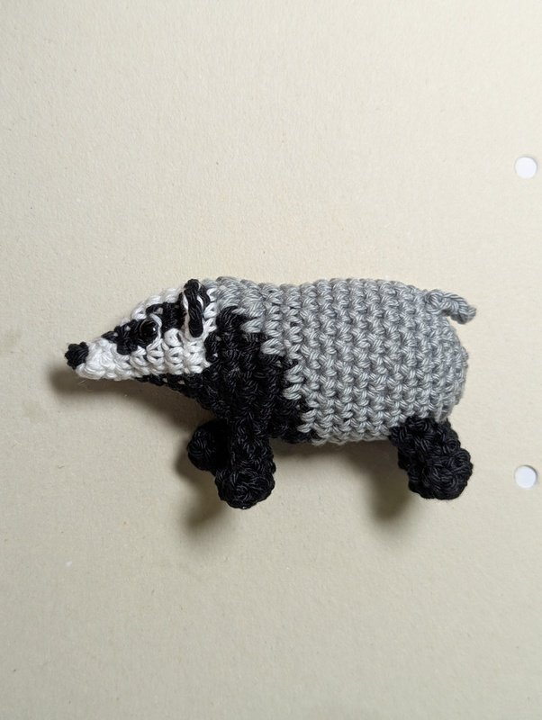 Der Dachs wird bei Nadelstärke 2,5 etwa 4 cm hoch, 9 cm lang und 3,5 cm breit.