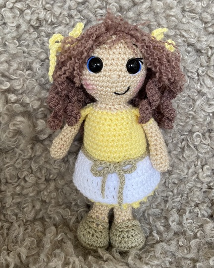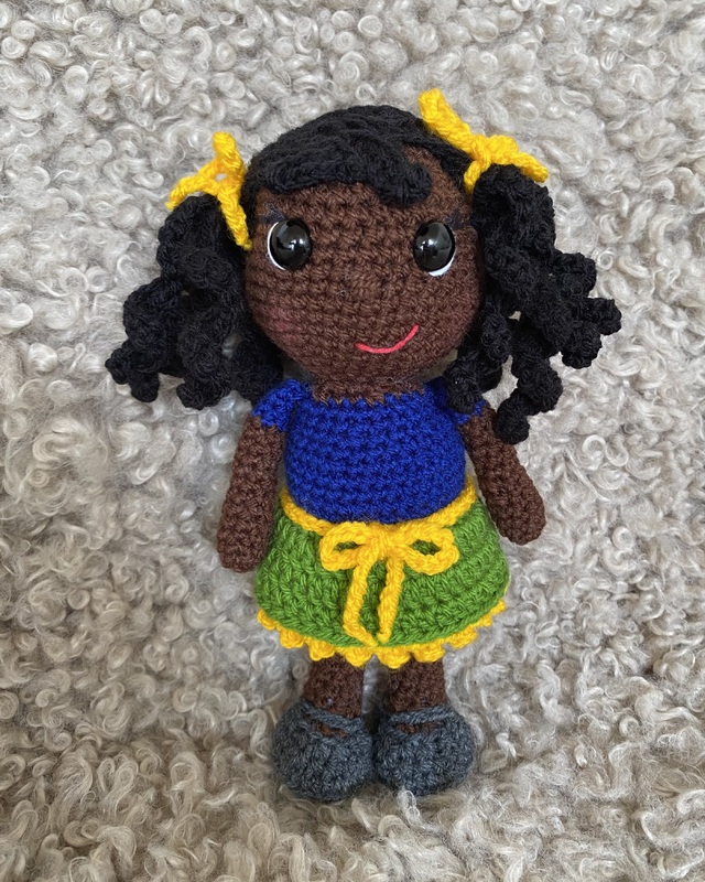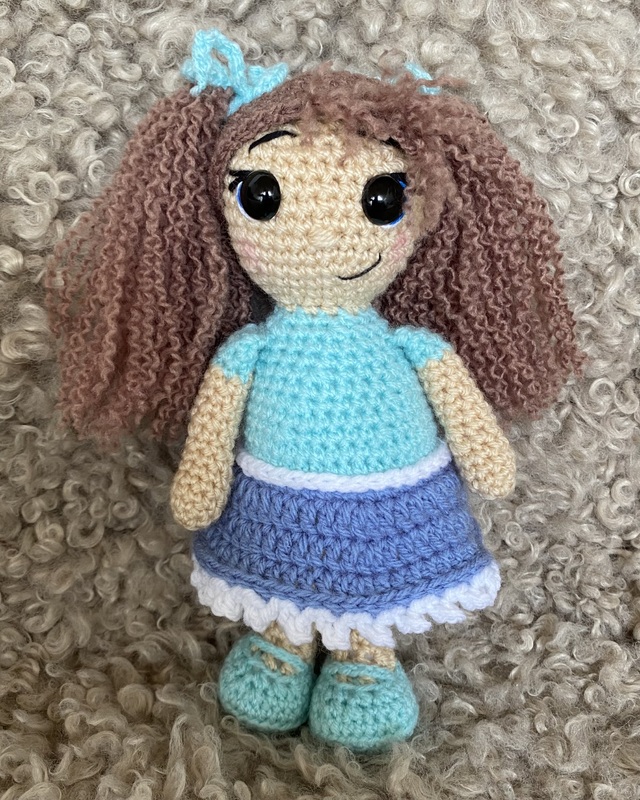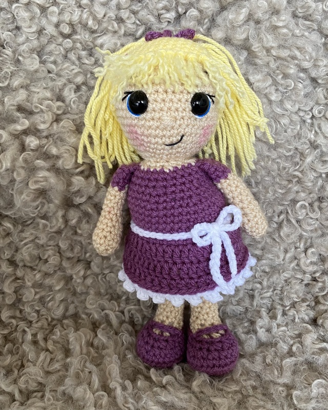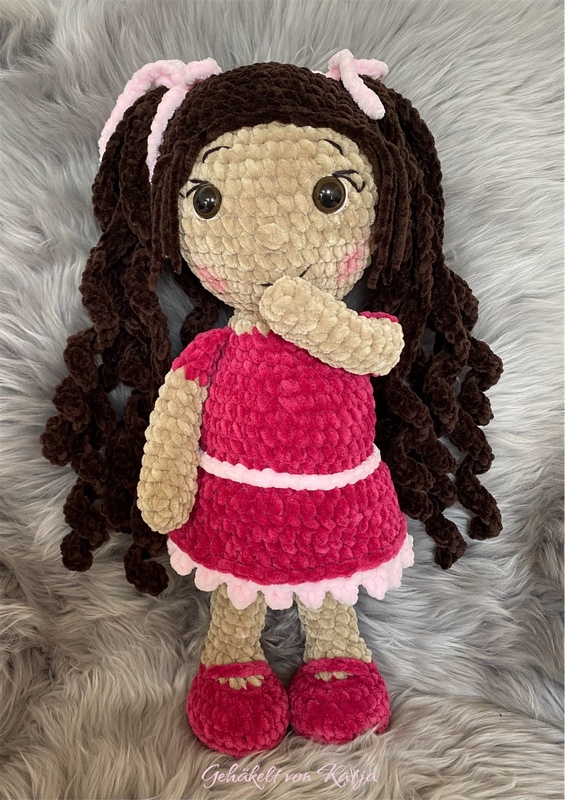 Mit Polyacryl ist die Puppe etwa 25 cm gross. Häkelst du mit Baumwolle wird sie kleiner, mit Chenille grösser (ca 35cm)