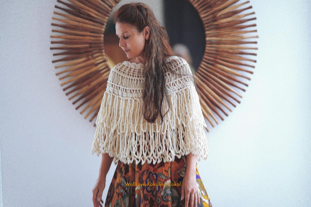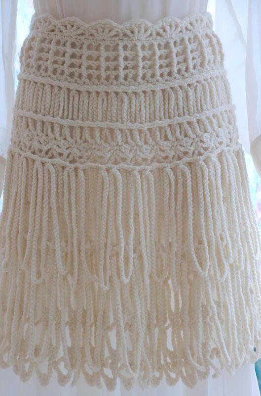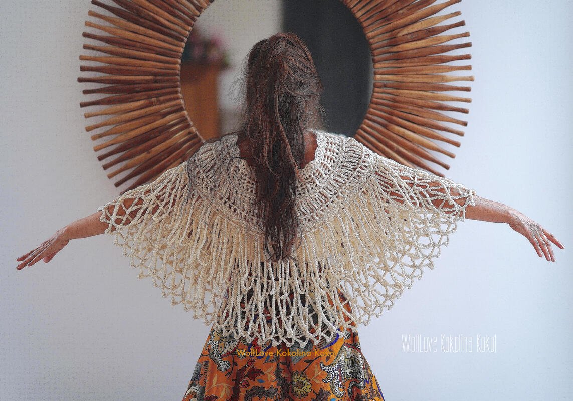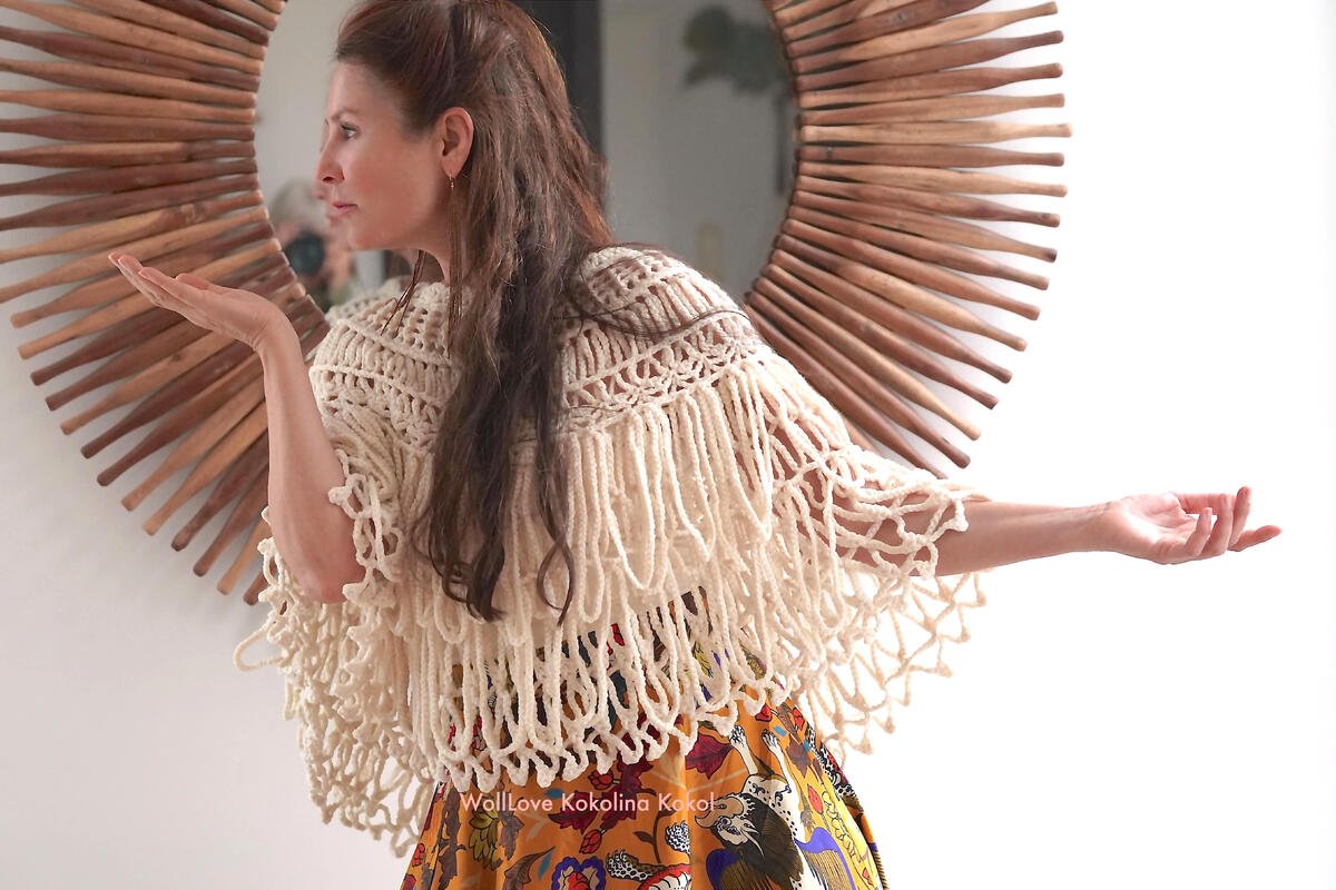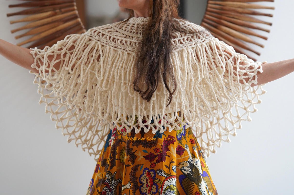 Als luftiger, femininer Schulterwärmer, als festlicher Kragen oder auch als verspielter, schwingender Rock, mit und ohne Fransen. Ein Muster das an Makramee erinnert,