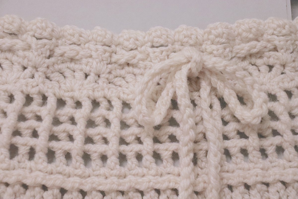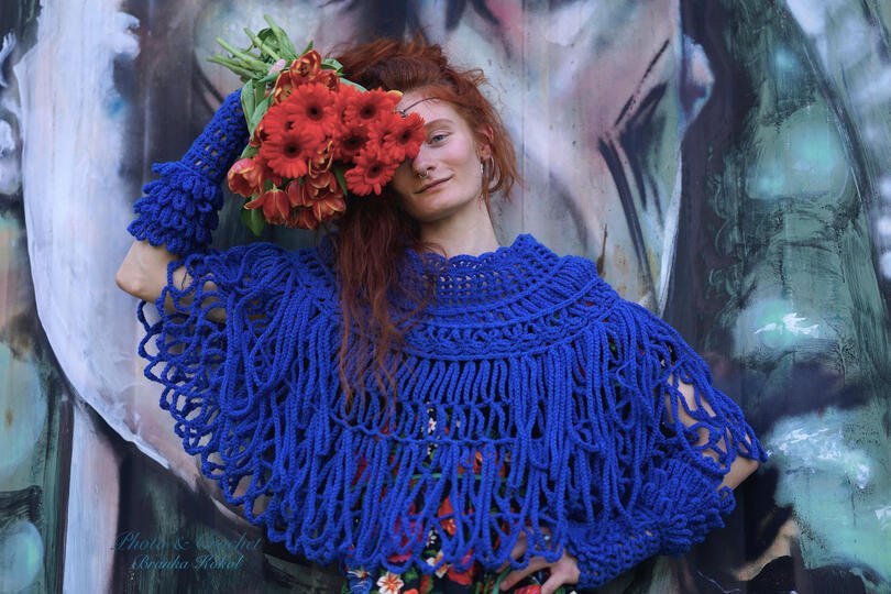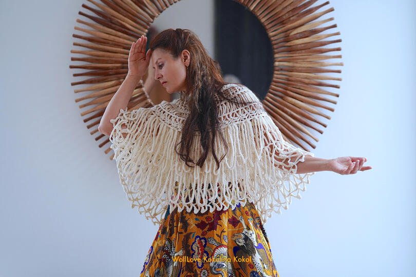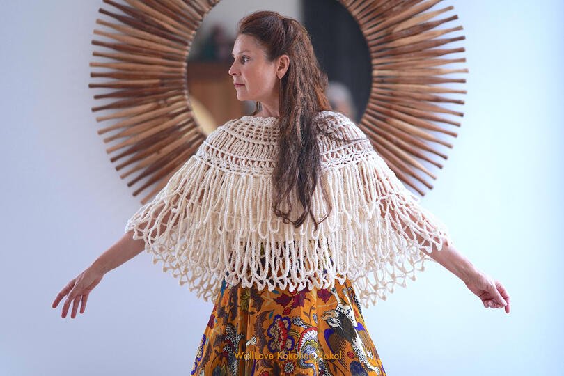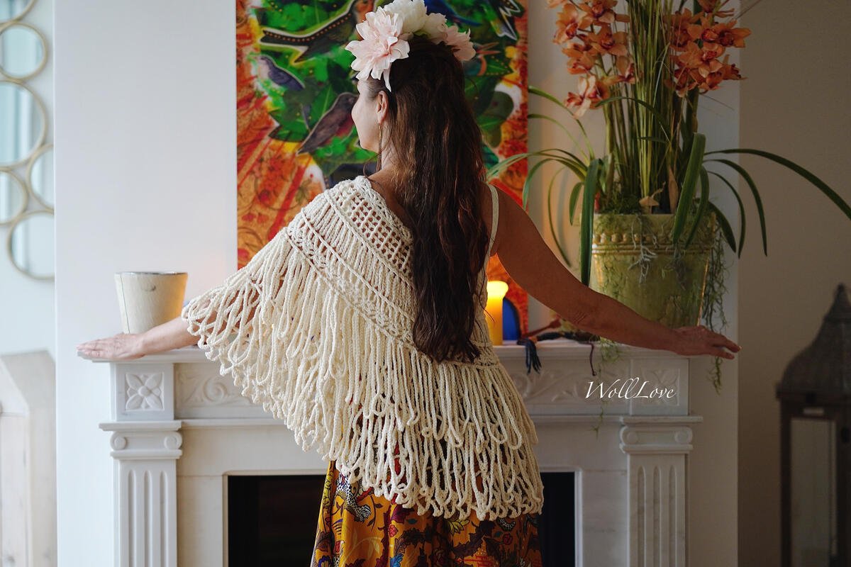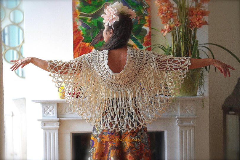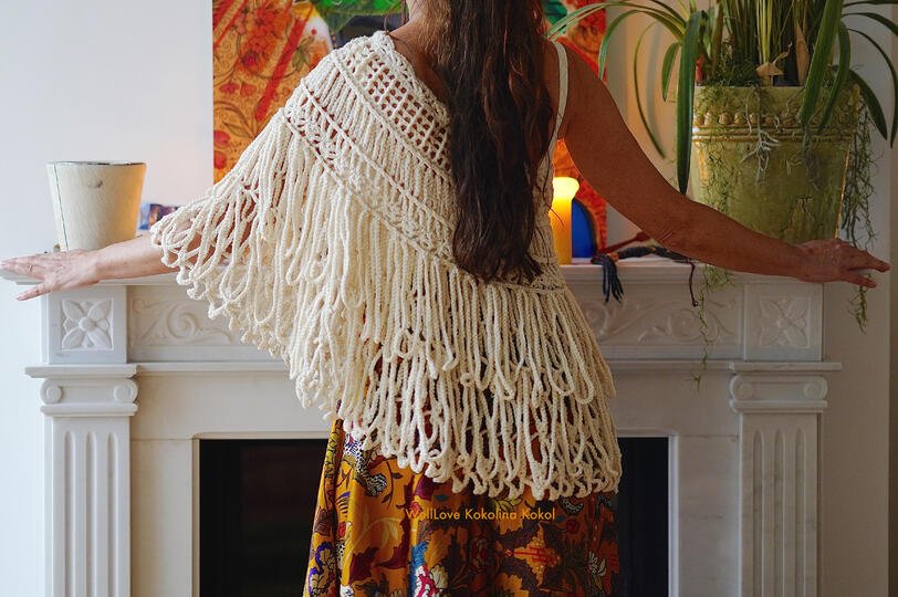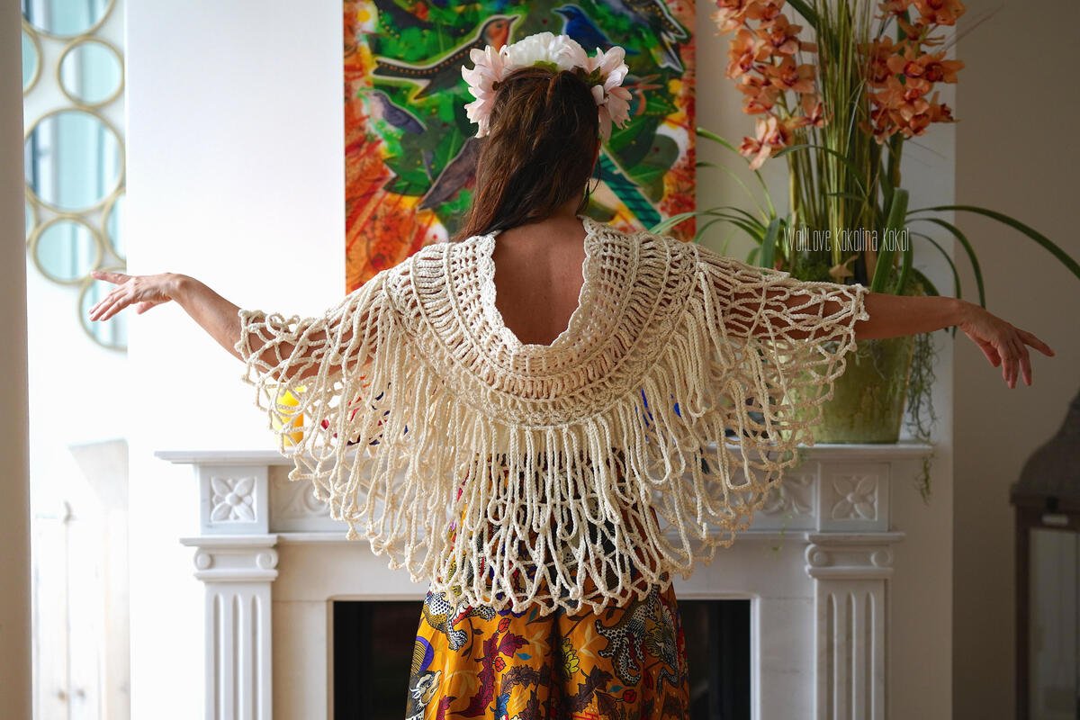 Als luftiger, femininer Schulterwärmer, als festlicher Kragen oder auch als verspielter, schwingender Rock, mit und ohne Fransen. Ein Muster das an Makramee erinnert,