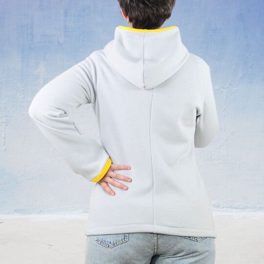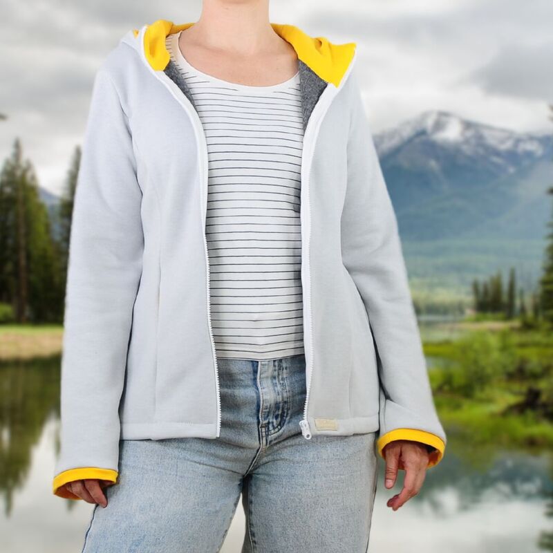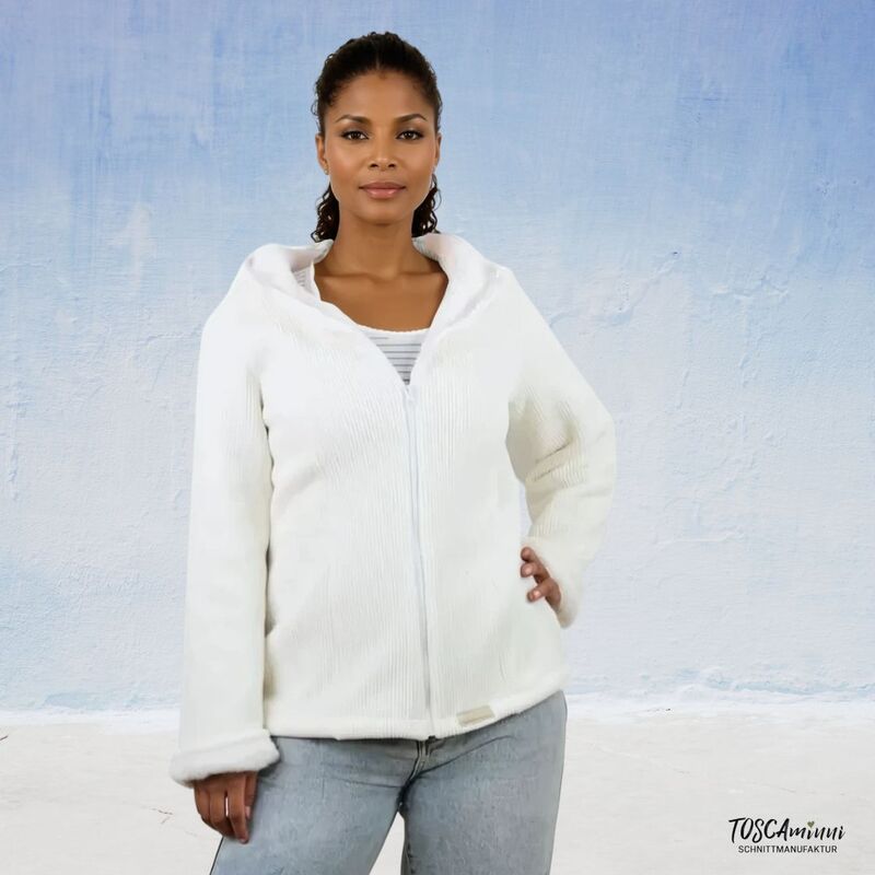 Dieses Schnittmuster ermöglicht es dir, eine stylische Sweater-Jacke mit Kapuze zu nähen.