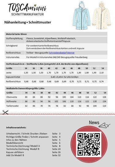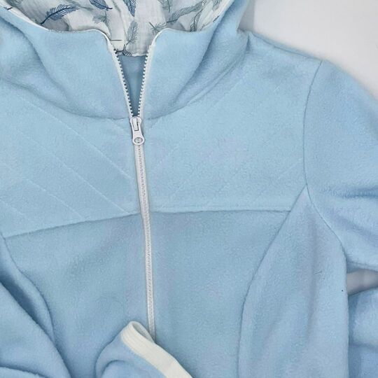 Für diese Jacke werden kuschelige Stoffe empfohlen, wie zum Beispiel Alpenfleece oder ein Strickstoff mit Microfleece innen. Diese Stoffe sorgen dafür, dass die Jacke während der kalten Jahreszeit schön warm und gemütlich ist.