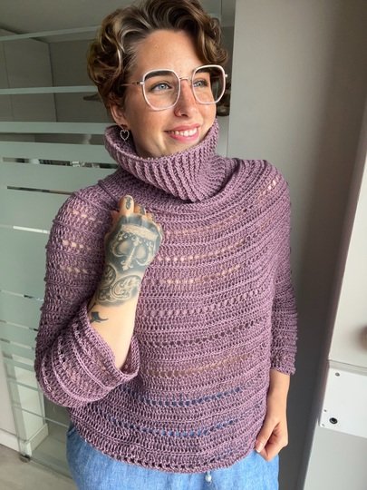 Klar, modern und mit einem Hauch Extravaganz – „Stella“ ist der perfekte Begleiter für alle, die handgemachte Mode lieben. Der strukturreiche Rollkragenpullover wird nahtlos von oben nach unten gehäkelt und überzeugt durch seine klaren Linien, interessante Muster und eine angenehm körpernahe Passform.