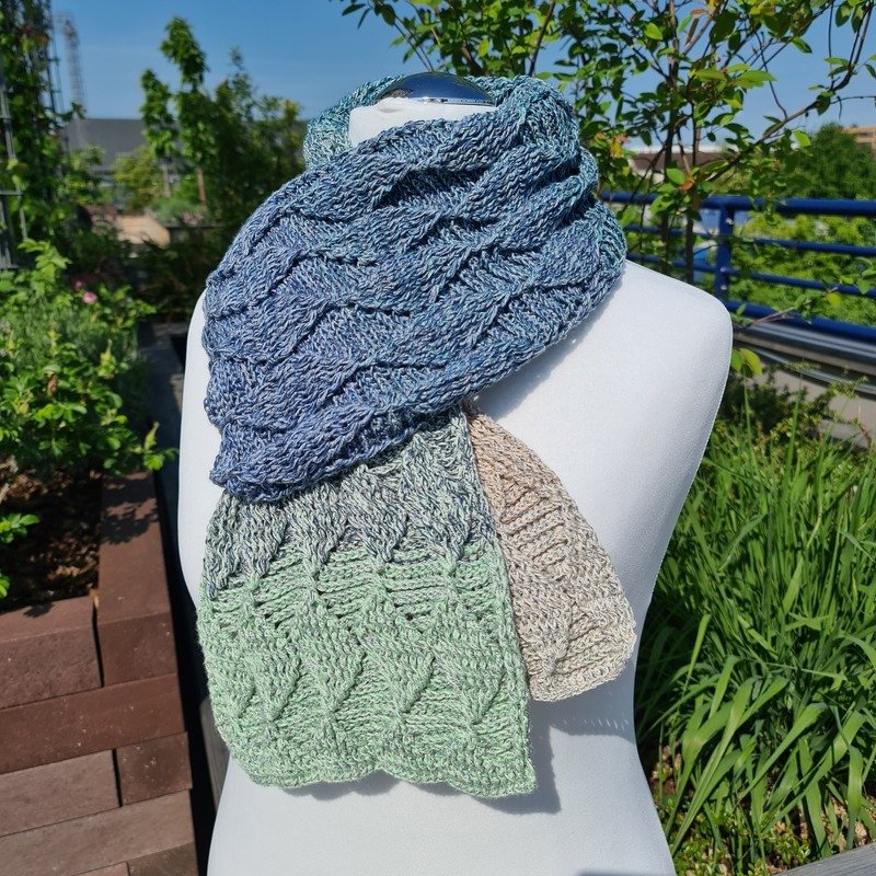 Der Schal Halia ist ein schnell gehäkelter Unisex Schal, der in jeder beliebigen Breite und Länge gehäkelt werden kann. In dezenten Farben ein modischer Begleiter für Männer, etwas bunter ein tolles Accessoire für Damen.