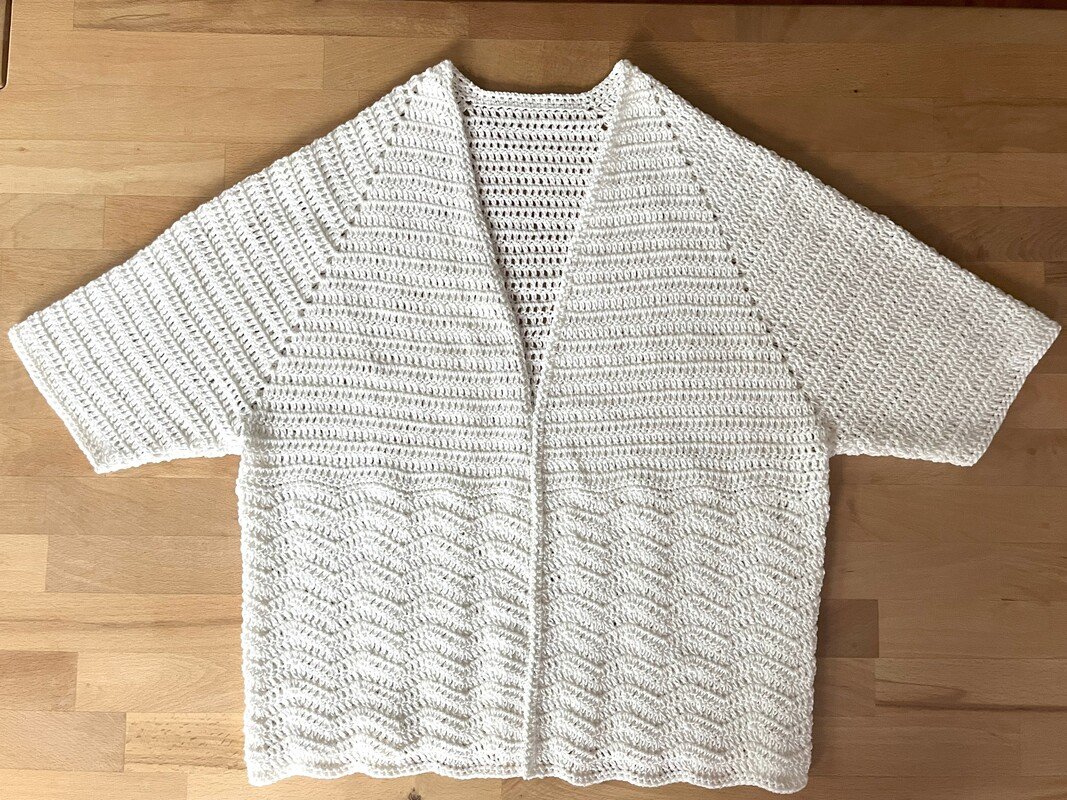 Kurze Sommerjacke mit Raglanärmeln, das von oben gearbeitet wird. Das Jäckchen ist leicht und schnell nachzuarbeiten. Beschrieben wird Größe 36, die Größe, die Länge und die Länge der Ärmel sind leicht anpassbar.