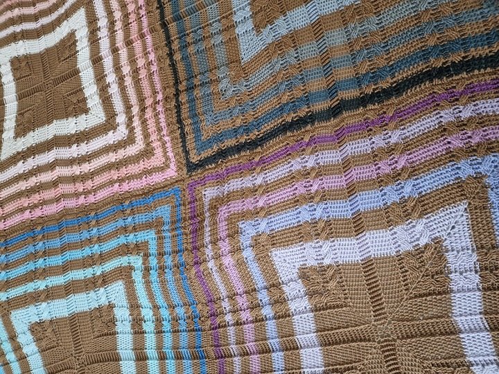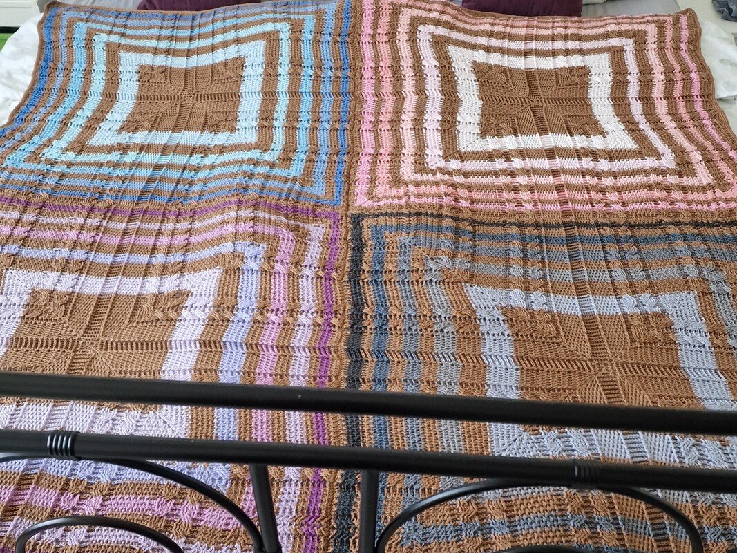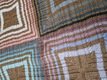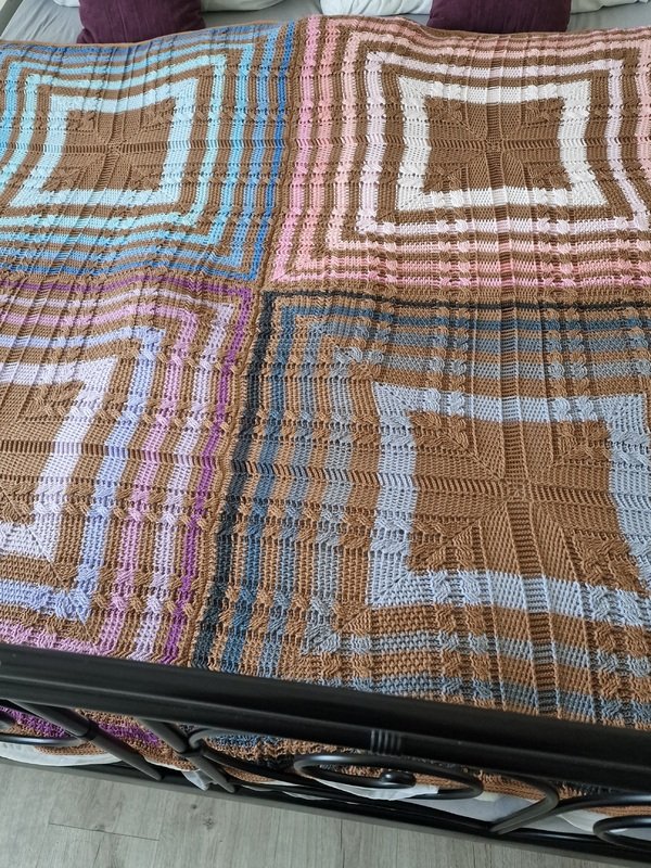 Die Decke wird in einem Mustermix gearbeitet, wobei die einzelnen Muster immer bis zum Schluss weiterlaufen, was eine ganz besondere Optik bewirkt. Ich wollte eine bunte Decke und habe für jedes Quadrat eine andere Farbkombi verwendet, wobei die Grundfarbe immer gleich ist. Wenn Du vier gleiche Bobbel verwendest, erhältst Du wieder eine ganz andere Optik, da Du dann genau siehst, wie die Muster über alle 4 Quadrate laufen und eine Einheit ergeben.