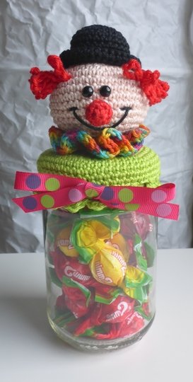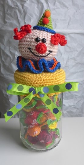 Angeboten wird eine ausführliche und gut bebilderte Häkelanleitung für das Bonbonglas Clown, nicht das fertige Glas. Die Anleitung umfaßt 11 Seiten und steht nach dem Kauf als PDF Datei zum Download bereit.