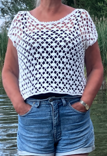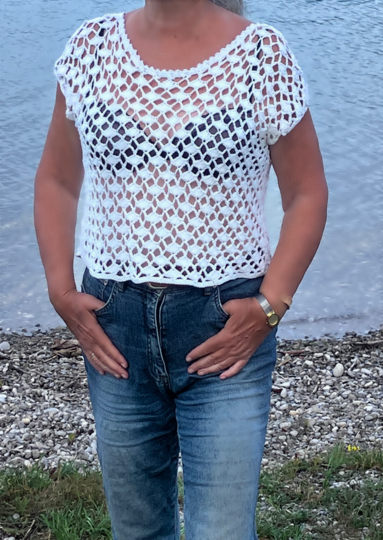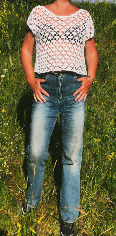Bei dieser Anleitung hast du es mit einem ganz einfachen Muster, einem einfachen Schnitt und einem schnellen Häkelfortschritt zu tun. Ideal für den Sommer. Darunter ein BH oder ein schwarzes Topp und schon ist man super und sexy angezogen. Du kannst es in allen Größen häkeln. Auch die Länge bestimmst du selbst.