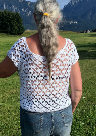 Alles, was du brauchst, wird ausführlich erklärt. Du musst nur Stäbchen und feste Maschen häkeln können. Das Shirt ist in 2 Teilen gehäkelt (Vorder– und Rückenteil).