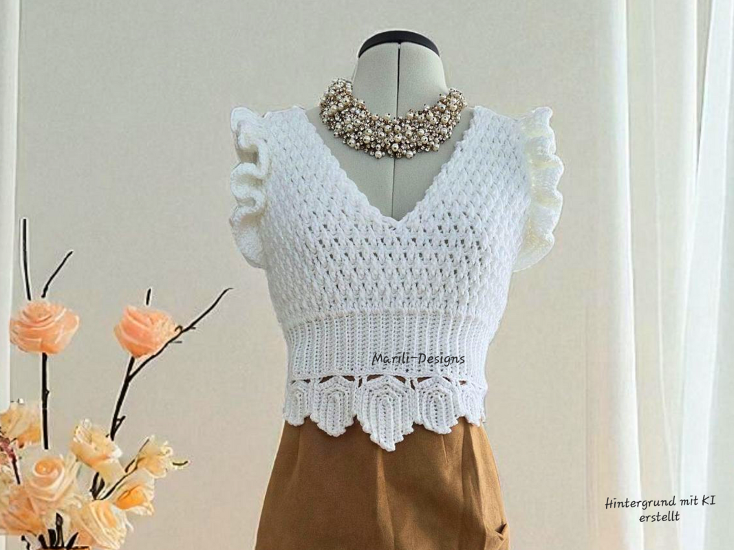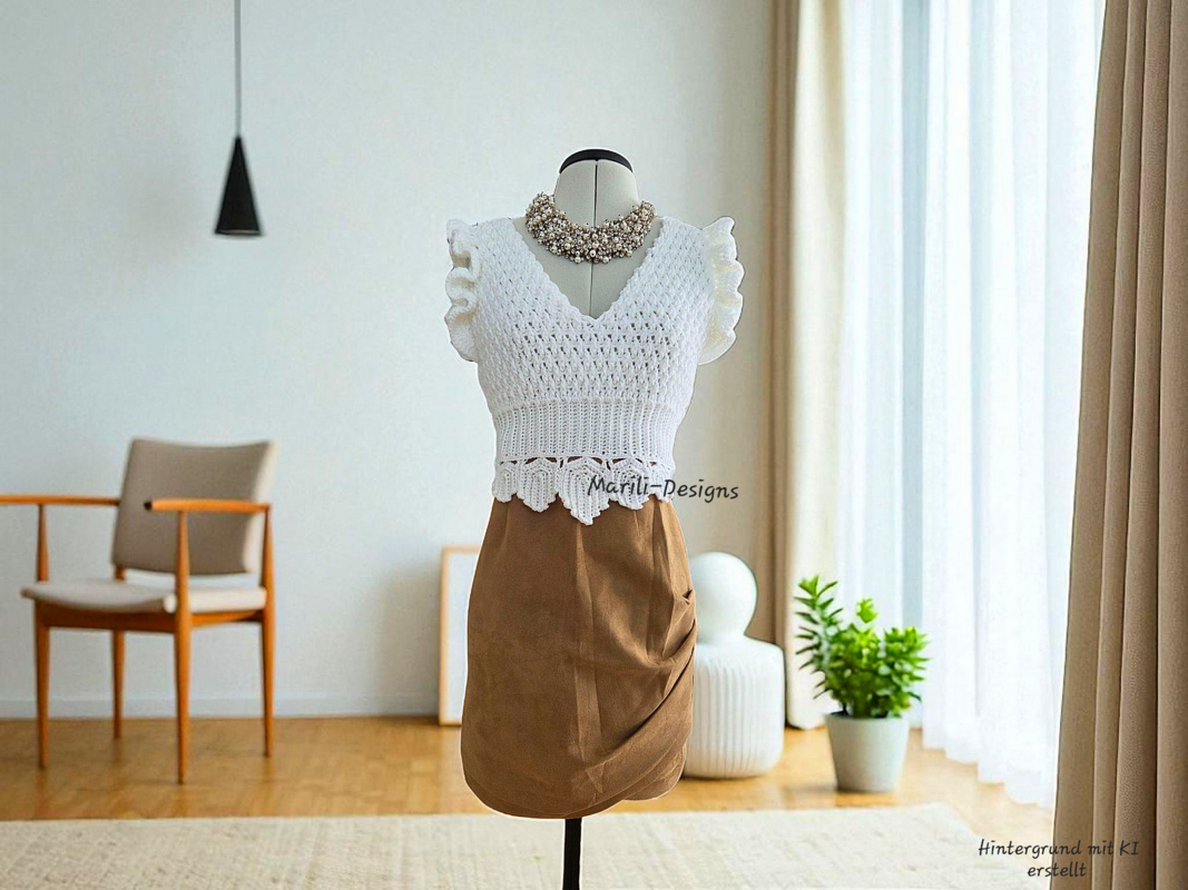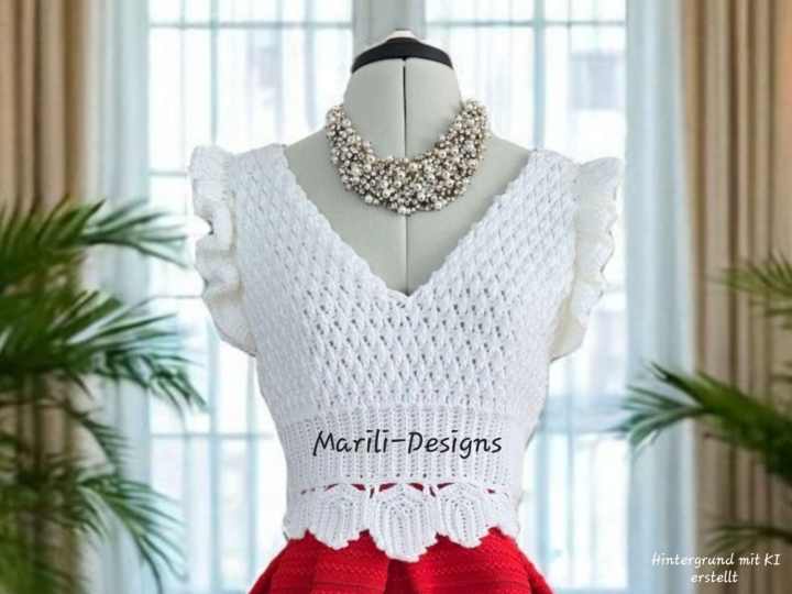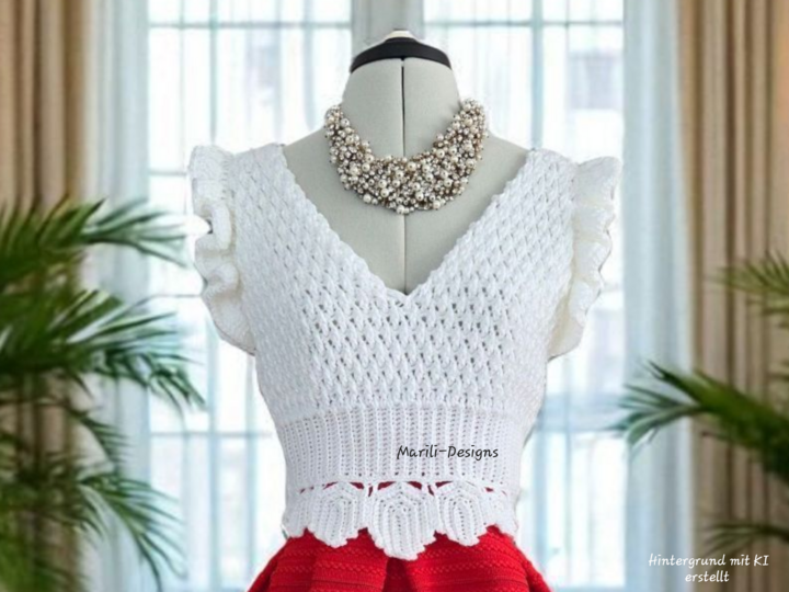 Das Top Valeria ist passend für viele Gelegenheiten (Date, Valentinstag, Weihnachten…) und ein echter Blickfang. Mit Hilfe der detaillierten PDF- Anleitung, die viele Farbfotos der Einzelschritte enthält, kann das Top schnell und einfach nachgehäkelt werden. Die Kleidergrößen XXS-XL werden Reihe für Reihe beschrieben. Eine komplette Häkelschrift des ganzen Oberteiles ist nicht enthalten. Zur Verdeutlichung des Musters sind jedoch für alle wichtigen Stellen handschriftliche Auszüge der Häkelschrift enthalten. Zudem wird in der Anleitung genau beschrieben wie das Top vergrößert werden kann. Eine Maschenprobe ist selbstverständlich ebenfalls enthalten.