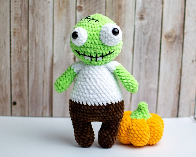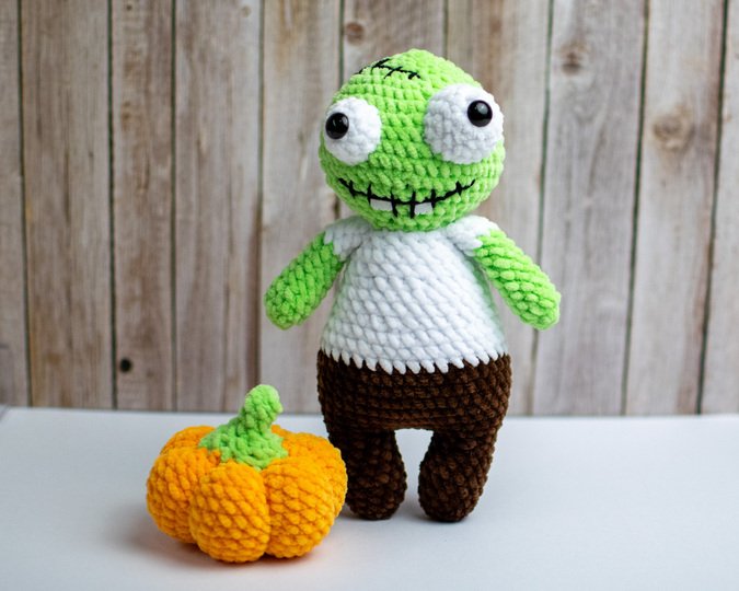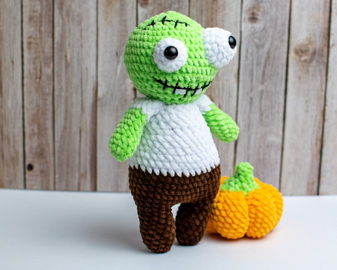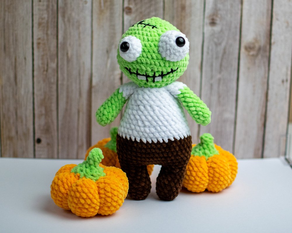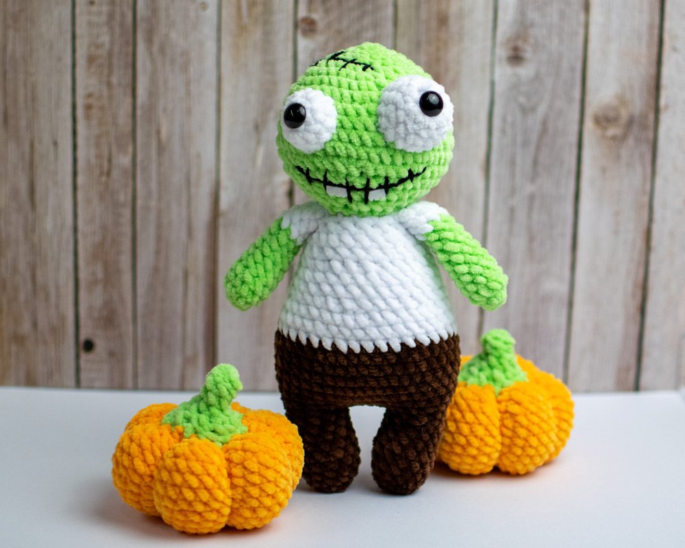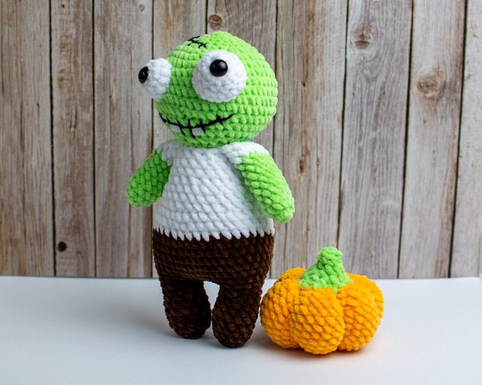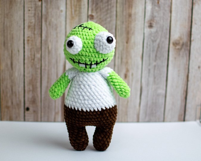 Mit dieser Häkelanleitung kannst du einen niedlichen, etwas gruseligen Zombie als Amigurumi-Figur selbst häkeln.