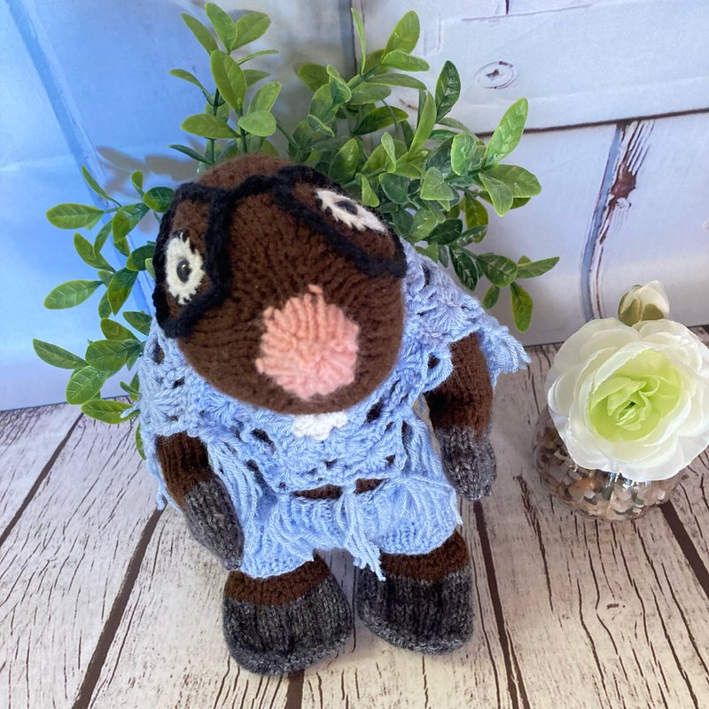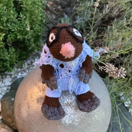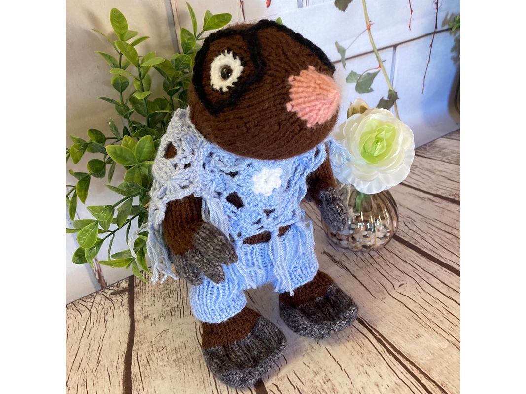 Strickanleitung für einen Maulwurf mit Poncho und Hose. Die Strickanleitung ist im pdf-Format zum Download. Die Anleitung ist in deutscher und englischer Sprache geschrieben und umfasst 8 Seiten. Der fertige Maulwurf ist ca. 30 cm groß. Alle Teile werden auf einem Nadelspiel in Runden gestrickt.