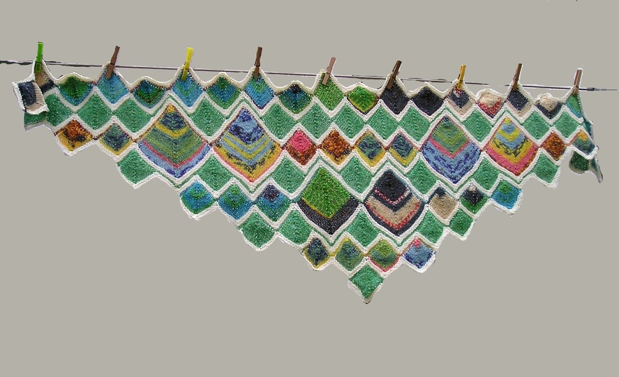 Es besteht aus vielen kleinen und wenigen großen Quadraten, die wegen der bunten Wolle alle unterschiedlich aussehen. Um das ganze zu beruhigen folgen auf die bunten Quadratreihen immer grüne Quadratreihen. Man kann das Ganze natürlich auch komplett bunt gestalten und so eine Menge Wollreste verarbeiten.