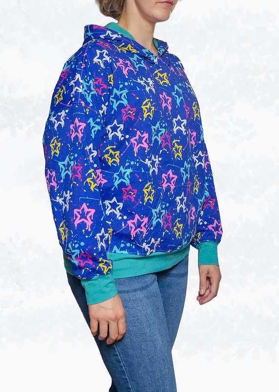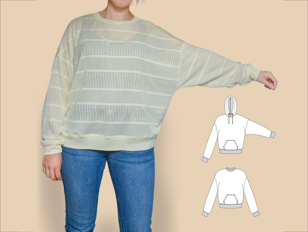Du kannst zwischen Kapuze oder Halslochbündchen wählen, optional eine Kängurutasche aufsetzen und die Bündchen aus Jersey oder Bündchenware arbeiten. So kannst du das Modell an jede Jahreszeit und deinen persönlichen Stil anpassen.
