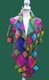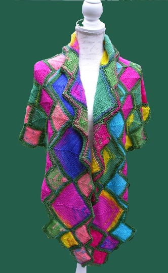 Es besteht kleinen und großen Quadraten, die wegen der bunten Wolle alle unterschiedlich aussehen. Die Quadrate sind von grünen Zick-Zack-Reihen eingefasst. Um das Ganze zu beruhigen folgen auf die bunten Quadratreihen einfarbig lilane Quadratreihen. Man kann das Ganze natürlich auch komplett bunt gestalten .