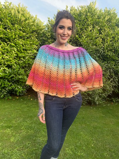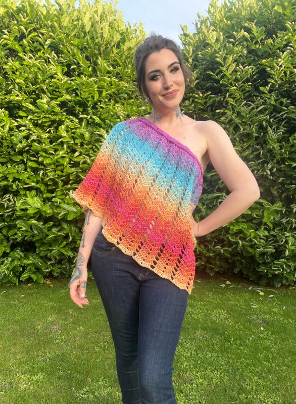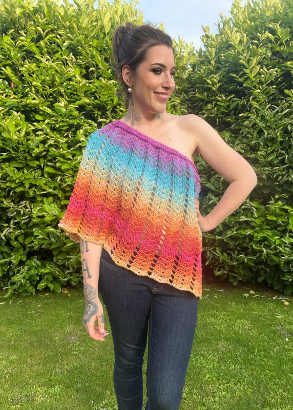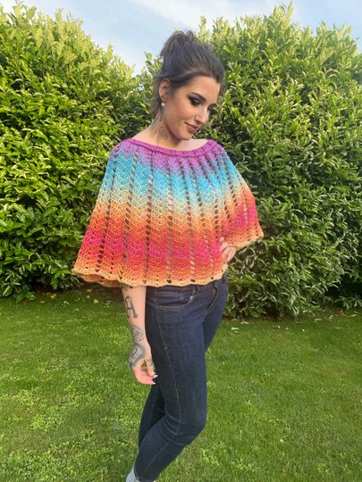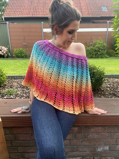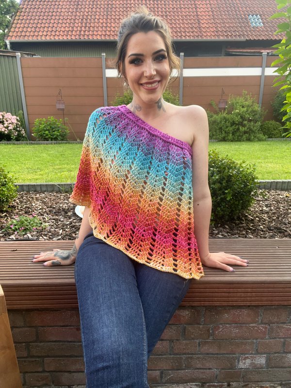 Durch die großzügige Ausschnittform kannst du den Rainbow ganz flexibel tragen: als luftigen Poncho über einem Top, als schulterfreies It-Piece mit Wow-Effekt oder ganz klassisch als lockeres Sommertuch. Ob am Strand, beim Stadtbummel oder auf dem Balkon – Rainbow macht überall eine gute Figur.
