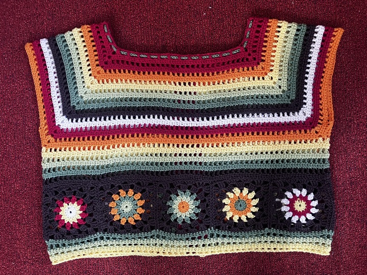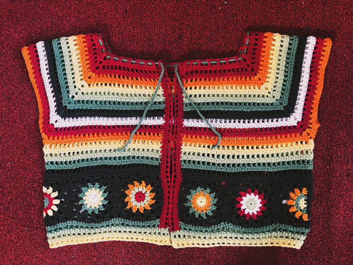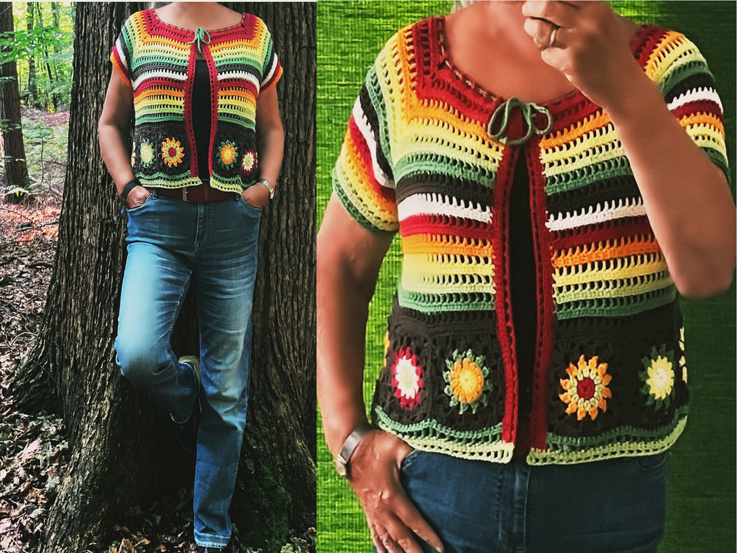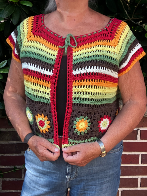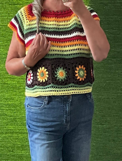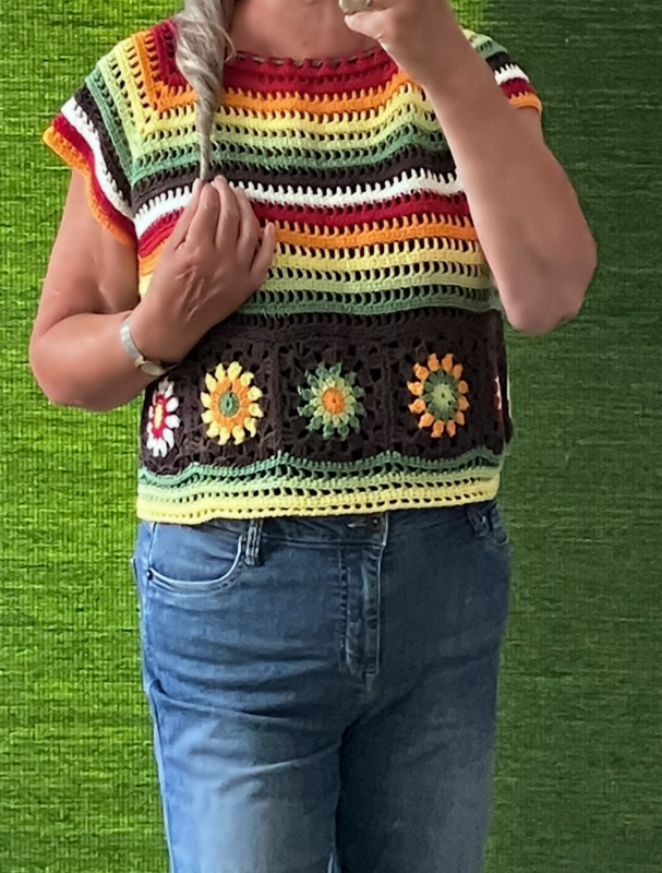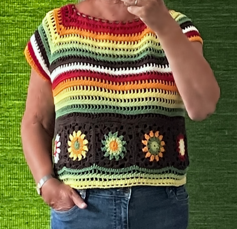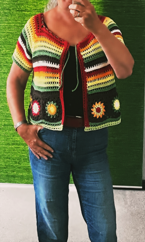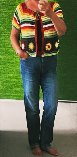 Zurück in die Zeit der Hippies und Flower-Power-Bewegung - eine bunte Zeit . Man kann dieses Design als Jäckchen häkeln oder als T-Shirt. Ala Shirt ist es rundherum geschlossen. Es ist als Raglan-von-Oben (RVO) gehäkelt. Ich zeige, wie man das Shirt für Große und Kleine, Mollige und Schlanke häkeln kann. Das ist der Vorteil der RVO-Technik. Man kann es jederzeit anprobieren und sehen, ob es schon passt. Es passt also immer. Die Länge des Jäckchens und die Länge der Ärmel bestimmst du selbst.