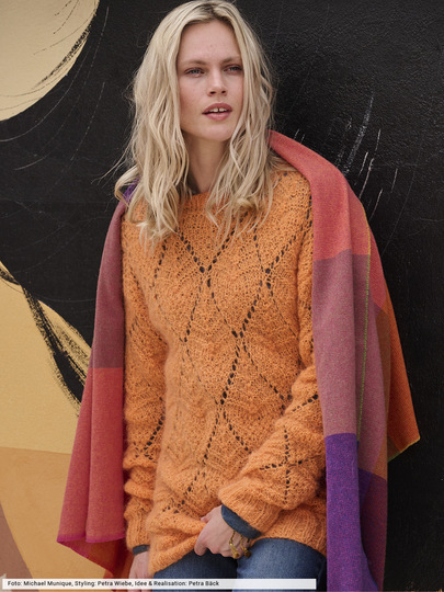 Soft das Garn, stark die Farbe – so entsteht ein smarter Longpulli, bei dem die großen Lochmuster-Rauten allover zum Einsatz kommen. Dafür haben wir eine übersichtliche Strickschrift erstellt, nach der du dich orientieren kannst. Wir haben außerdem auf einen Schnitt gesetzt, der gerade und schlicht ist. Dafür bringt das strahlende Rost-Orange jede Menge Energie in deine Herbstgarderobe und sorgt mit Jeans kombiniert für einen modischen Allday-Look.