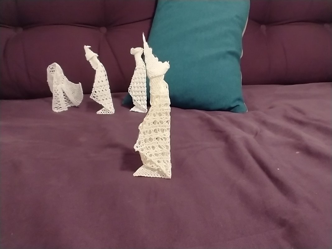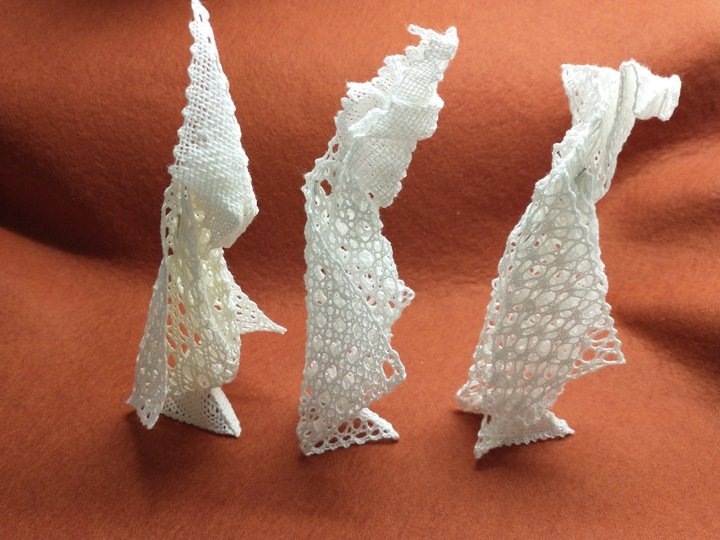 Anleitung für drei unterschiedlich geklöppelte Krippenfiguren (Drei Könige oder Weise), die durch Falten ihre endgültige Form erhalten.