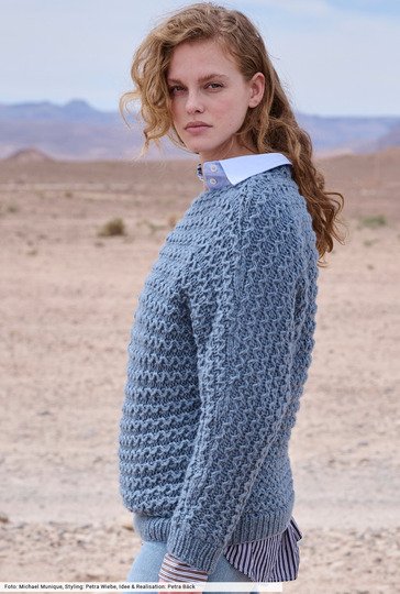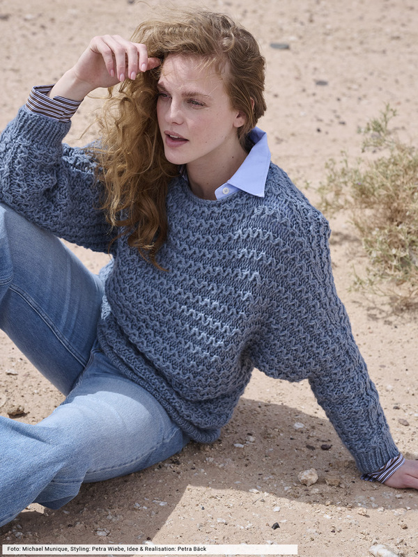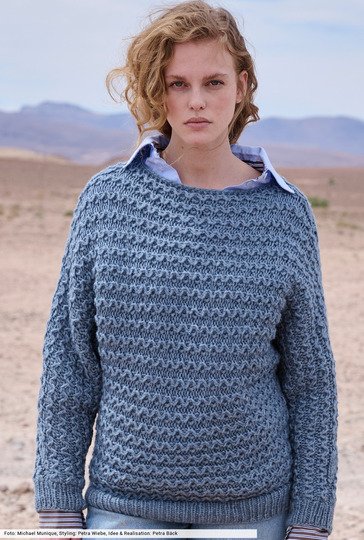 Ein dezentes Zickzack-Muster bildet die Grundlage für diesen saloppen Fledermauspulli aus edlem Schurwoll-Kaschmirgarn. Er wird in zwei Teilen quer von Ärmel zu Ärmel gestrickt und zum Schluss an den Schulter-, Ärmel- und Seitenkanten zusammengenäht. Das Finish bilden elastische Rippenbündchen, die für Formstabilität sorgen. Und das Beste? Der entspannte Blauton steht fast allen Frauen und funktioniert zu jeder Jahreszeit.