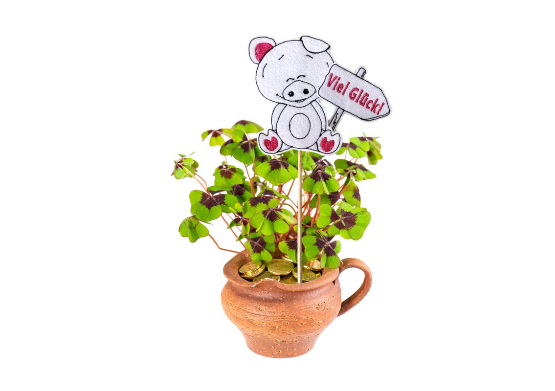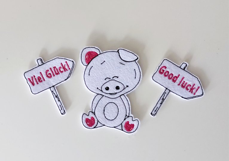 Stickdatei Glücksschweinchen mit Schild "Viel Glück!" und "Good luck!"