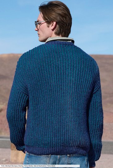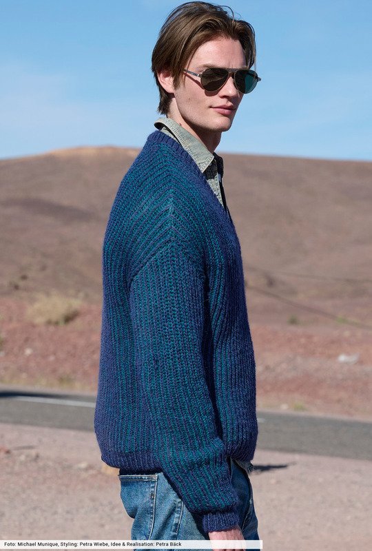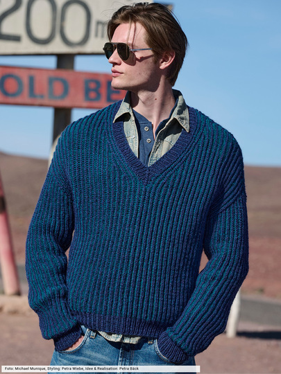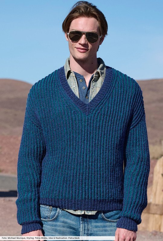 Klassische Patentrippen, neu gedacht: Dieser Pullover mit V-Ausschnitt überzeugt durch Struktur und klare Linien. Die royalblauen Rippen liegen auf, der hellere Petrolton hält sich dezent im Hintergrund. Schmale Bündchen aus rechten und linken Maschen sorgen für Halt und Stabilität. Ein toller Begleiter, der durch robustes Alpakamischgarn über viele Jahre sein gan persönliches Maschen-Highlight wird.