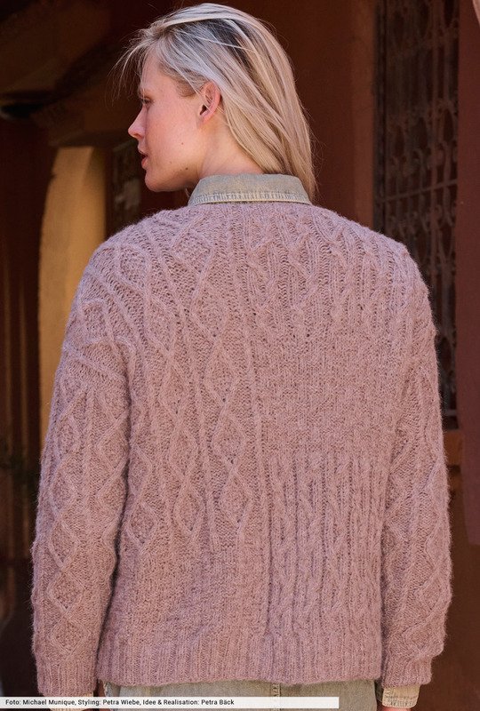 Rauten, Zöpfe und Strukturen – warum sich nur für eine Optik entscheiden? Wir haben hier drei verschiedene Muster zu einem lebendigen Gesamtbild vereint, das Tiefe und Individualität ausstrahlt. Dazu braucht es etwas Strickerfahrung und Geduld, aber es bringt auch Spannung in die Arbeit und zeigt, wie überaus kreativ die Masche sein kann. Die Garnkomposition aus Schurwolle, Alpaka und Baumwolle lässt sich toll verstricken und gibt den Mustern jede Menge Profil.