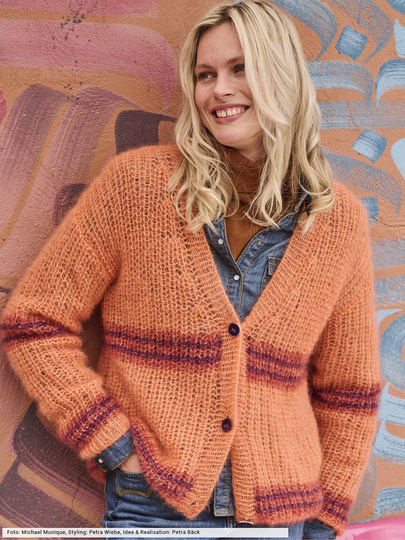Gerade die soften Mohairgarne bringen Knallfarben zum Leuchten. Hier vereinen sich strahlendes Orange mit Streifen in Aubergine und Dunkelorange zu einem lässigen Cardigan. Das Halbpatentmuster erscheint mit der etwas unruhigeren Seite nach außen, die dem ganzen aber die spannende Optik verleiht. Das Finish bilden schmale Rippenblenden und – als Kontrast – Knöpfe in sattem Violett, die du direkt bei der Herstellerfirma bestellen kannst.